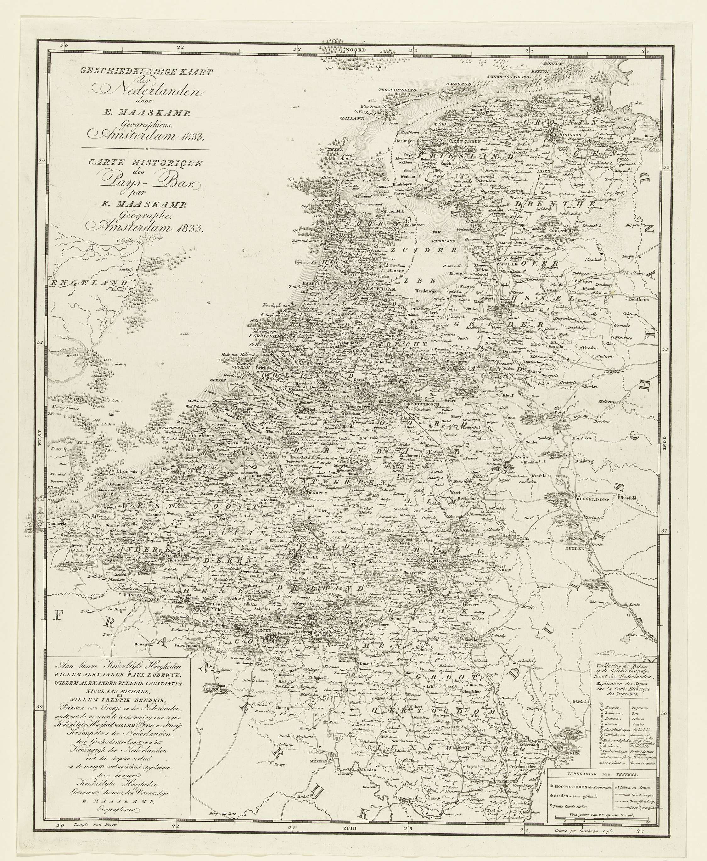 Geschiedkundige kaart van de Nederlanden. Bij plaatsnamen staan jaartallen van belangrijke gebeurtenissen.