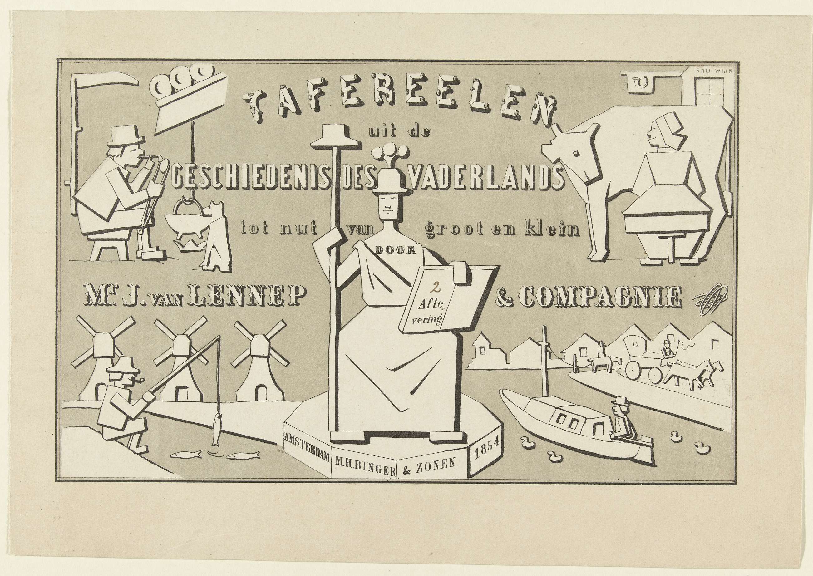 Titelprent met Hollandse tafereeltjes voor: Tafereelen uit de Geschiedenis des Vaderlands tot nut van groot en klein, Mr. J. van Lennep & Compagnie; 2e aflevering.