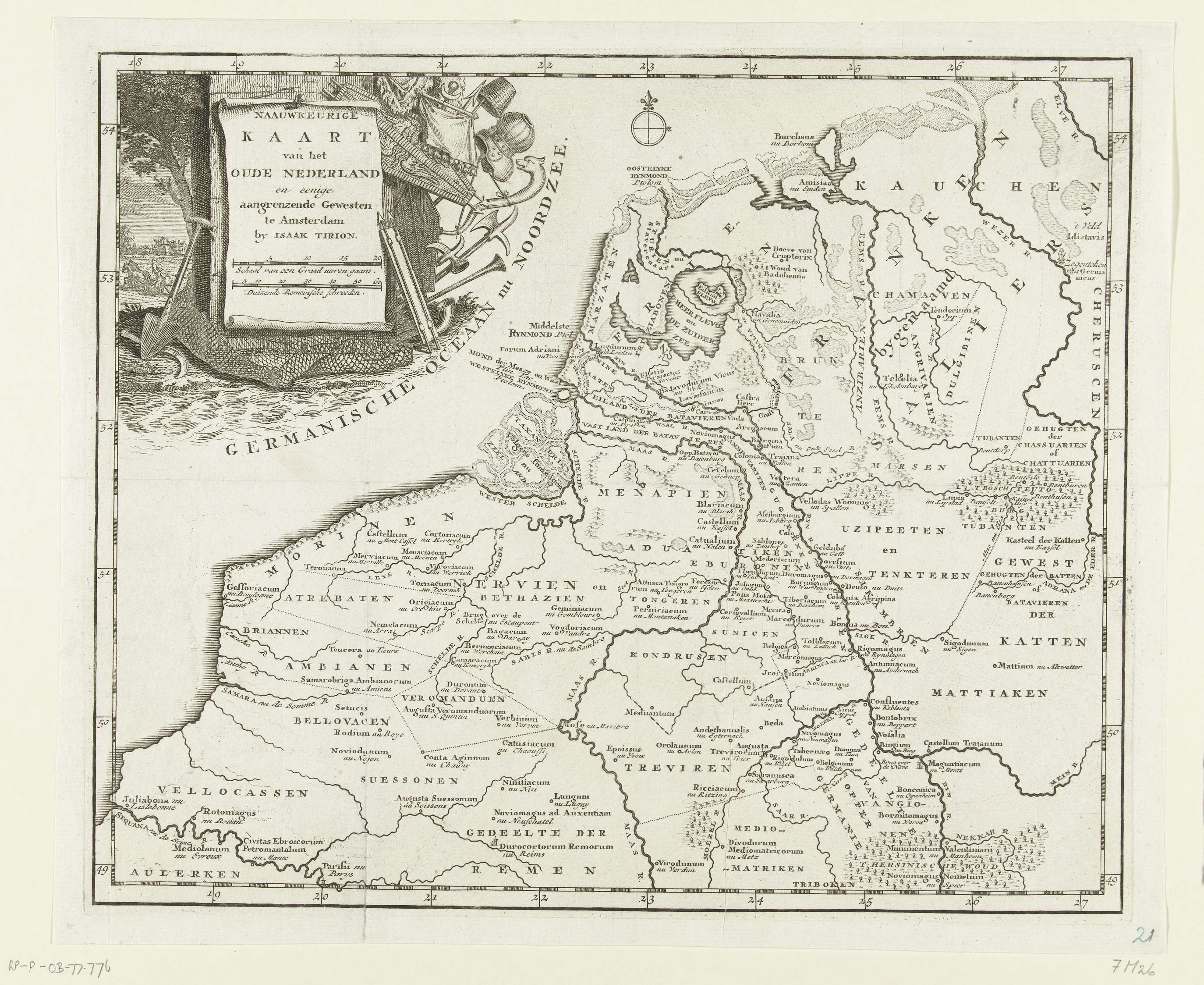 Kaart van de Nederlanden ten tijde van de Bataven. Linksboven een cartouche met de titel versierd met attributen van de visserij, jacht en landbouw.