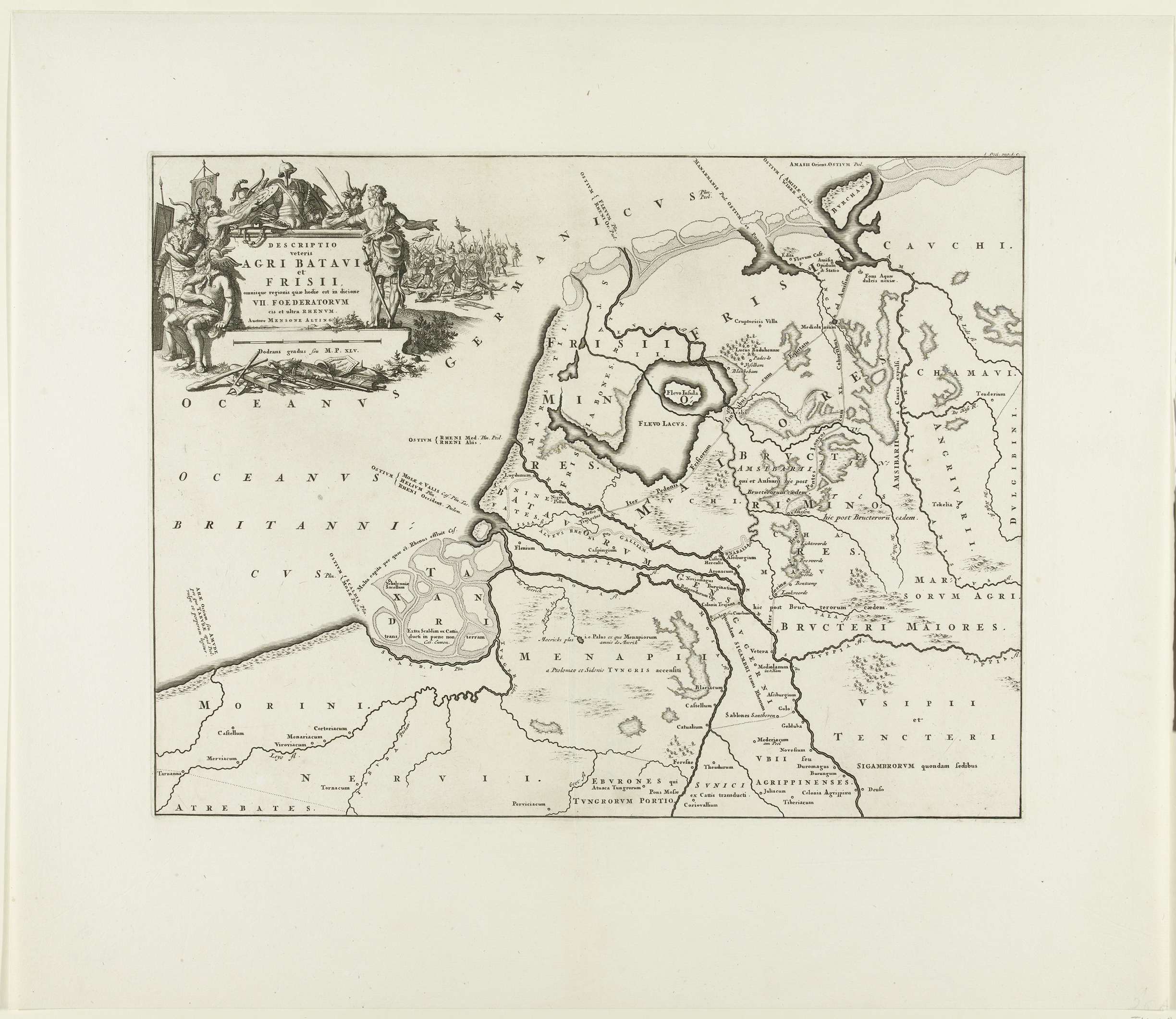 Kaart van het oude Nederland van de Bataven en Friezen. Maakt deel uit van 16 kaarten van het land van de Bataven en de Friezen eerst vervaardigd voor en opgenomen in M. Alting, Descriptio ant. agri Batavi et Frisii, s. notitia Germ. infer., 2 delen, 1697-1700. Hergebruikt in F. Halma, Tooneel der Vereenigde Nederlanden en ...