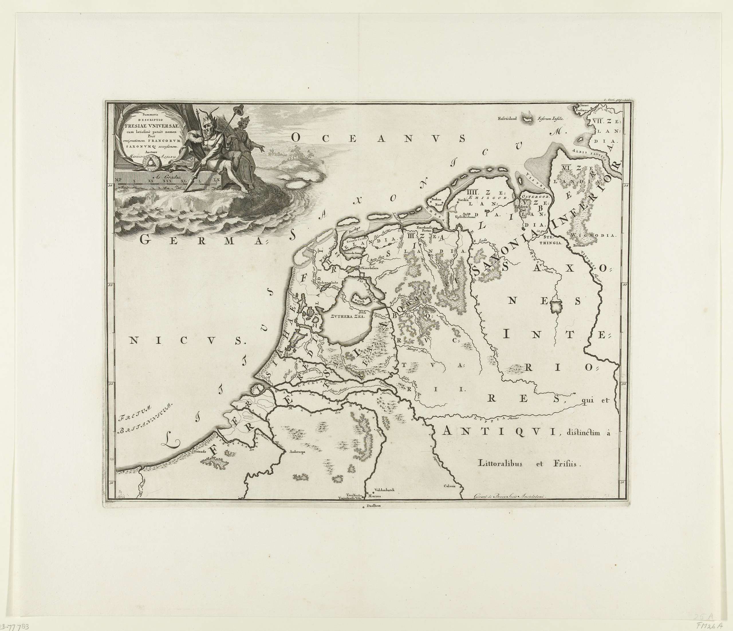 Kaart van de Friese gebieden in Nederland en Duitsland. Maakt deel uit van 16 kaarten van het land van de Bataven en de Friezen eerst vervaardigd voor en opgenomen in M. Alting, Descriptio ant. agri Batavi et Frisii, s. notitia Germ. infer., 2 delen, 1697-1700. Hergebruikt in F. Halma, Tooneel der Vereenigde Nederlanden en onderhorige ...