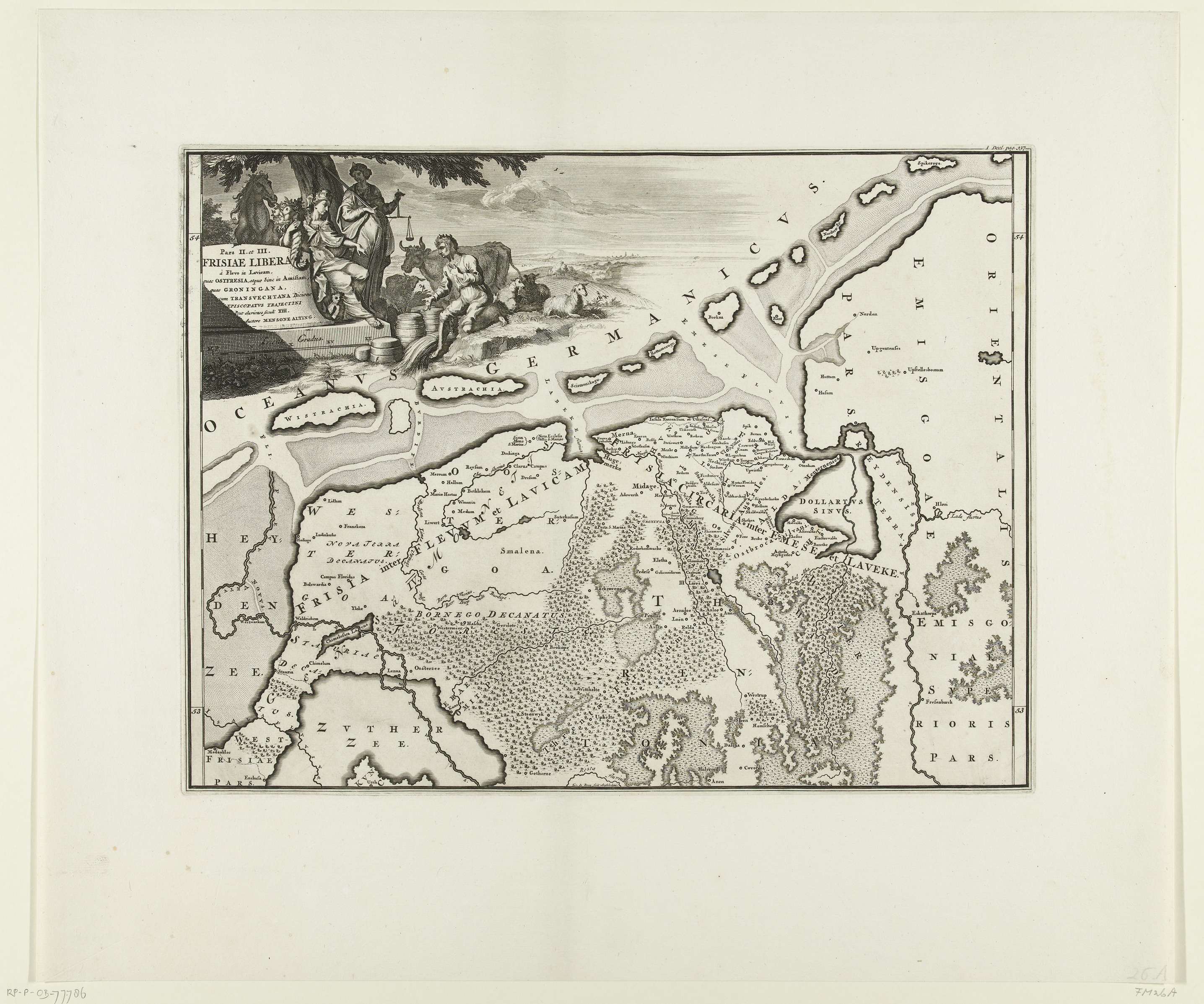 Kaart van de Friese gebieden in noordelijk Nederland. Maakt deel uit van 16 kaarten van het land van de Bataven en de Friezen eerst vervaardigd voor en opgenomen in M. Alting, Descriptio ant. agri Batavi et Frisii, s. notitia Germ. infer., 2 delen, 1697-1700. Hergebruikt in F. Halma, Tooneel der Vereenigde Nederlanden en onderhorige landschappen, ...