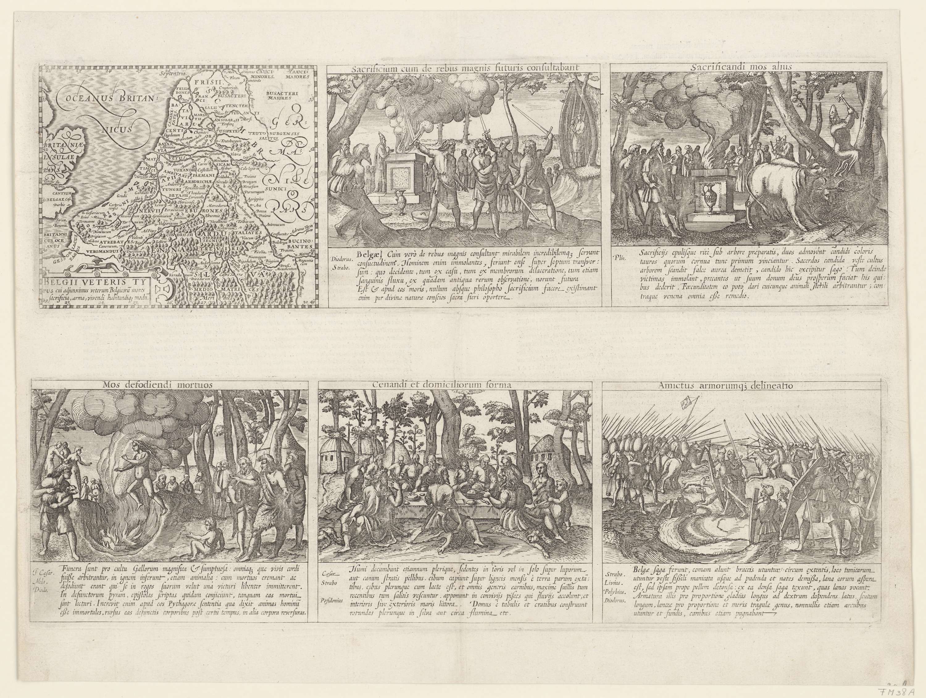 Blad met zes afzonderlijke voorstellingen, gedrukt van twee platen met elk drie scènes. Kaartje van Nederland met omringende landen en vijf voorstellingen met Latijnse onderschriften van de Germaanse gewoonten bij offerplechtigheden, maaltijden, begrafenis en oorlog. Blad uit een boek genomen, met op de achterzijde tekst. Afkomstig uit: Pieter van den Keere, Germania inferior id est, ...