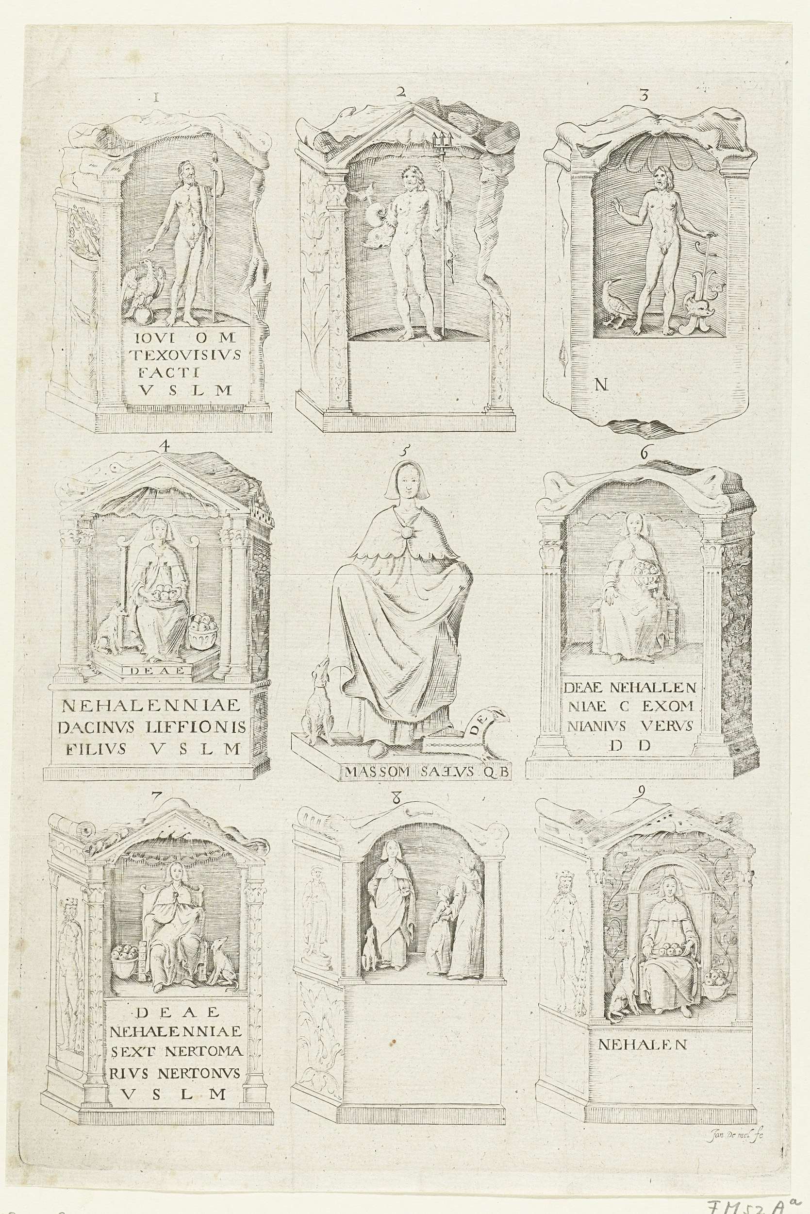 Blad met overzicht van altaren met Nehalennia en andere goden, genummerd 1-9. Afkomstig uit: Olivier de Wree, Historiae comitum Flandriae libri prodromiduo, Lucas van den Kerchove, Brugge 1650. Tweede staat waarin pagina en nummer rechtsboven zijn verwijderd.