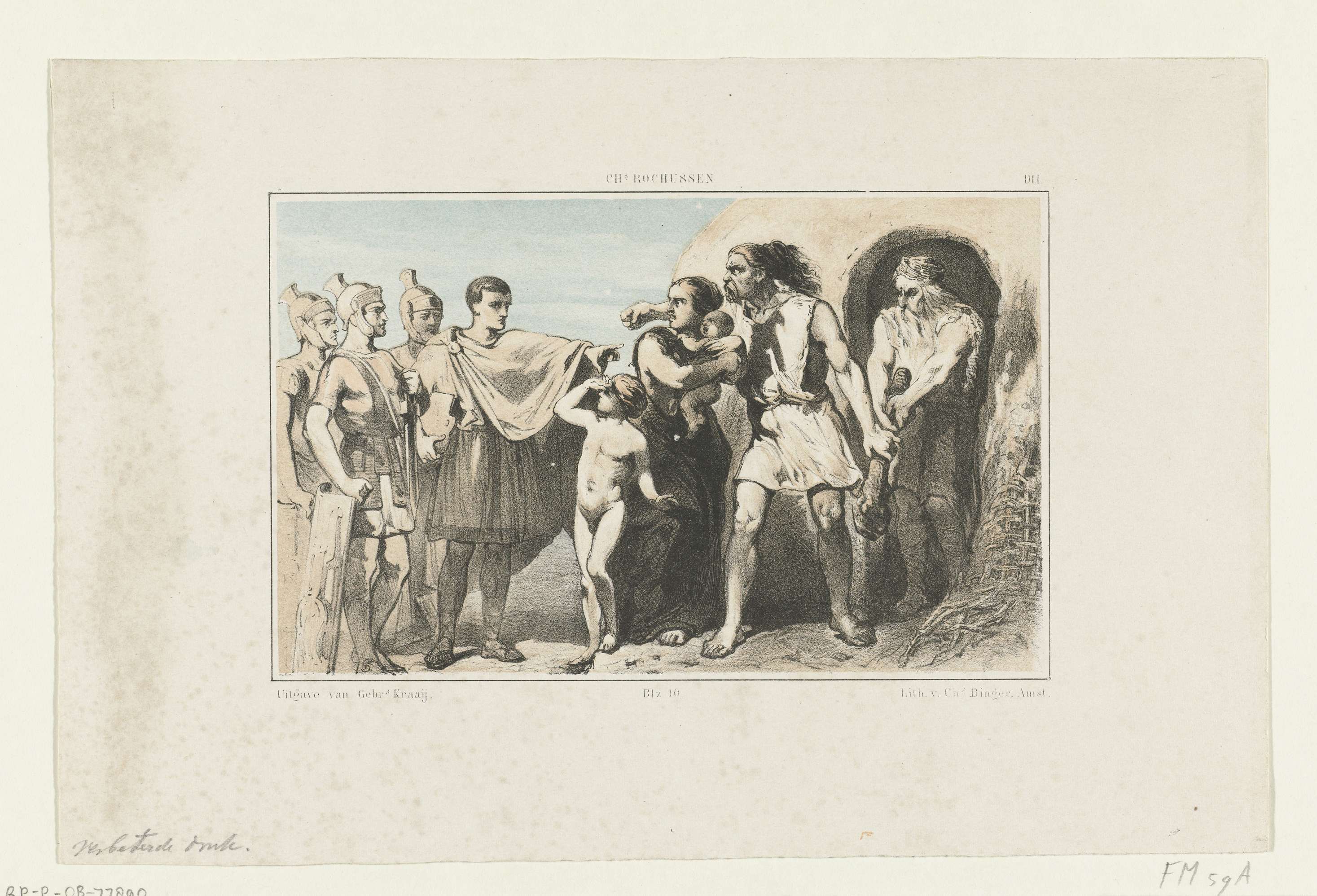 Een Romeinse veldheer (Caligula?) tegenover een Noord-Nederlandse familie. Deze proefdruk is volgens een bijgevoegde aankondiging van de uitgever verspreid onder de intekenaren van het boek: De voornaamste geschiedenissen van Noord-Nederland / door J. van Lennep aan zijne kinderen verhaald. Behoort bij de laatste aflevering van het eerste deel.