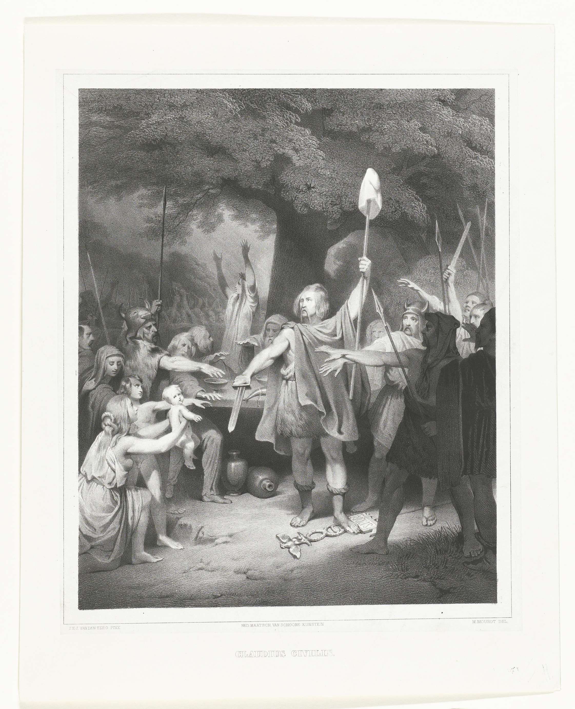 Claudius Civilis roept in een bos tot oorlog tegen de Romeinen op. In zijn handen een zwaard en een muts op een lans. Onder zijn voeten vertreedt hij een Romeinse standaard.