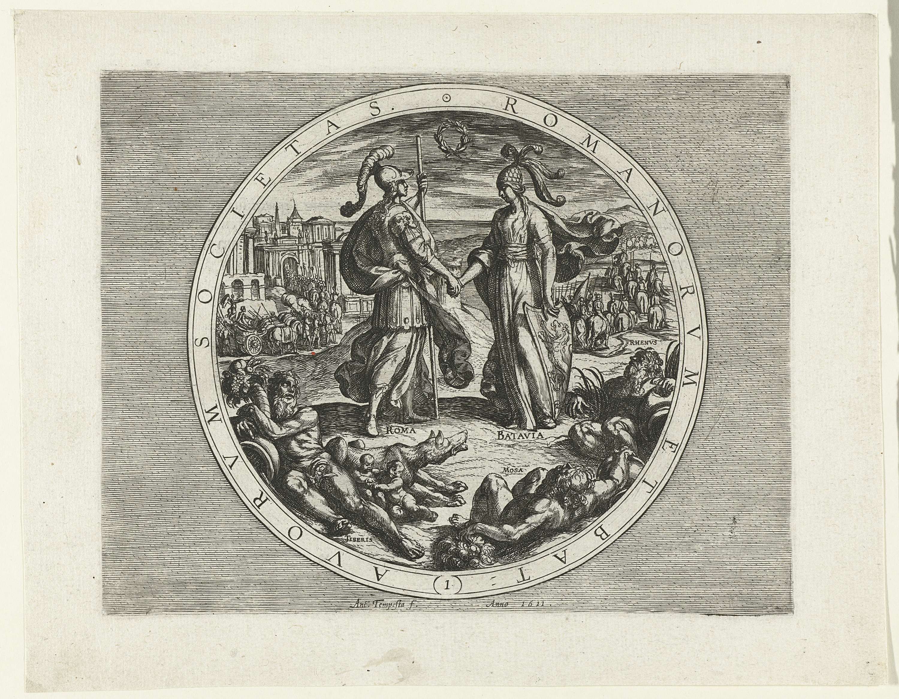 Ronde allegorische voorstelling waarin personificaties Roma en Batavia op het slagveld elkaar de hand schudden. Titelprent voor de serie prenten over de Bataafse Opstand: Batavorum cum Romanis bellum / à Corn. Tacito lib. IV & V. : Hist. olim descriptum, figuris nunc aeneis expressum, auctore Othone Vaenio Lugdunobatava = De Batavische oft oude Hollandtsche oorloghe ...
