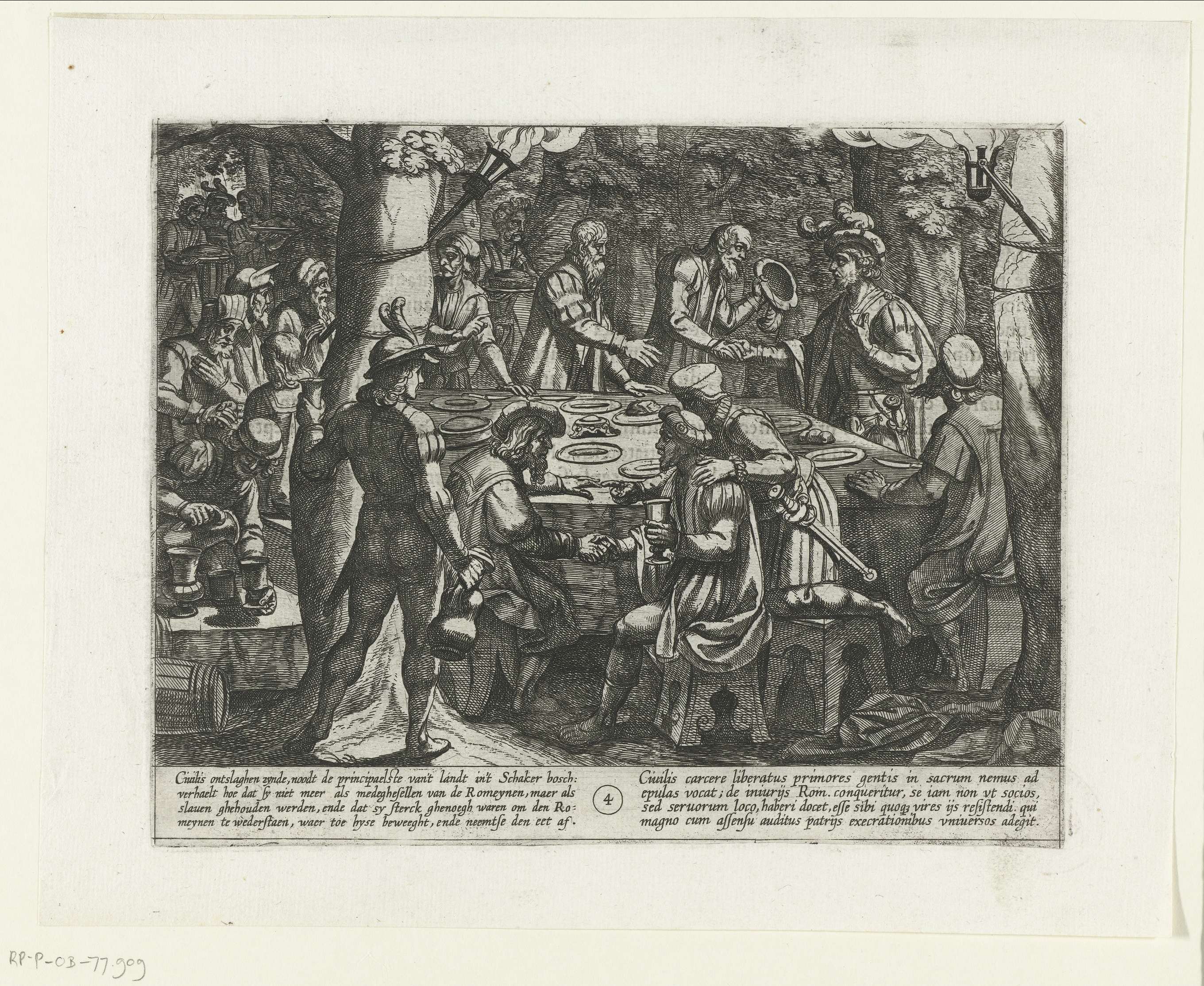 De samenzwering van Julius Civilis in het Schakerbos. Julius Civilis vertelt de ouderlingen tijdens een nachtelijke bijeenkomst in het woud dat zij door de Romeinen als slaafgemaakten worden behandeld. Prent nummer 4 in de serie prenten over de Bataafse Opstand: Batavorum cum Romanis bellum / à Corn. Tacito lib. IV & V. : Hist. olim ...