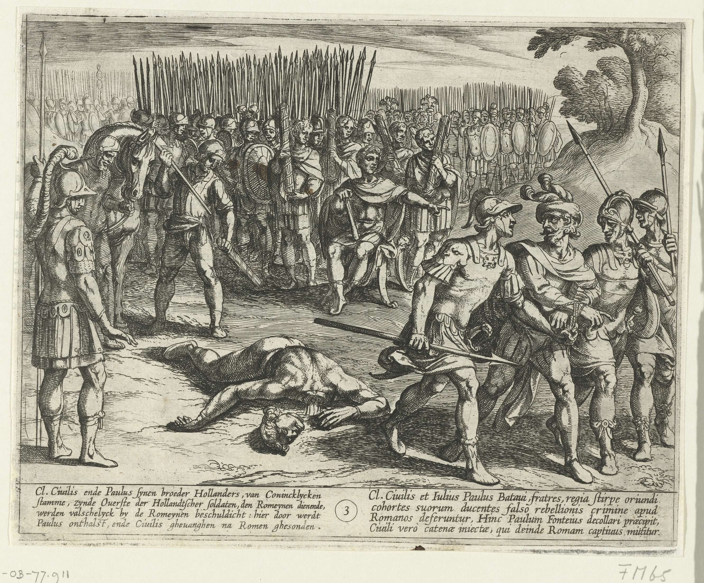 Claudius Civilis wordt gevangengenomen door de Romeinen en zijn broer Paulus wordt onthoofd. Prent nummer 3 in de serie prenten over de Bataafse Opstand: Batavorum cum Romanis bellum / à Corn. Tacito lib. IV & V. : Hist. olim descriptum, figuris nunc aeneis expressum, auctore Othone Vaenio Lugdunobatava = De Batavische oft oude Hollandtsche oorloghe ...