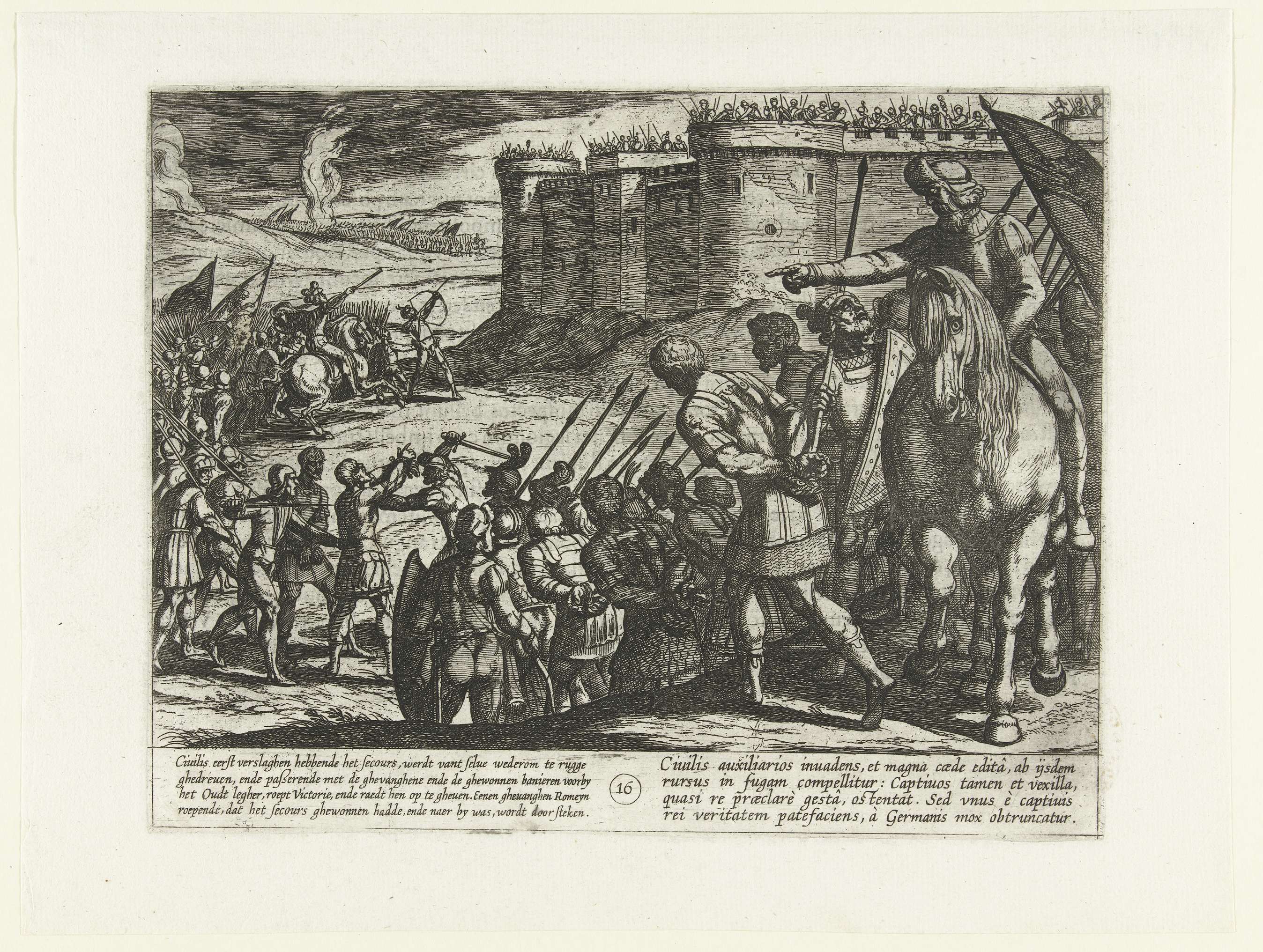 Gevangengenomen Romeinse soldaten en vaandels worden langs de Romeinse vesting geleid. Prent nummer 16 in de serie prenten over de Bataafse Opstand: Batavorum cum Romanis bellum / à Corn. Tacito lib. IV & V. : Hist. olim descriptum, figuris nunc aeneis expressum, auctore Othone Vaenio Lugdunobatava = De Batavische oft oude Hollandtsche oorloghe teghen de ...