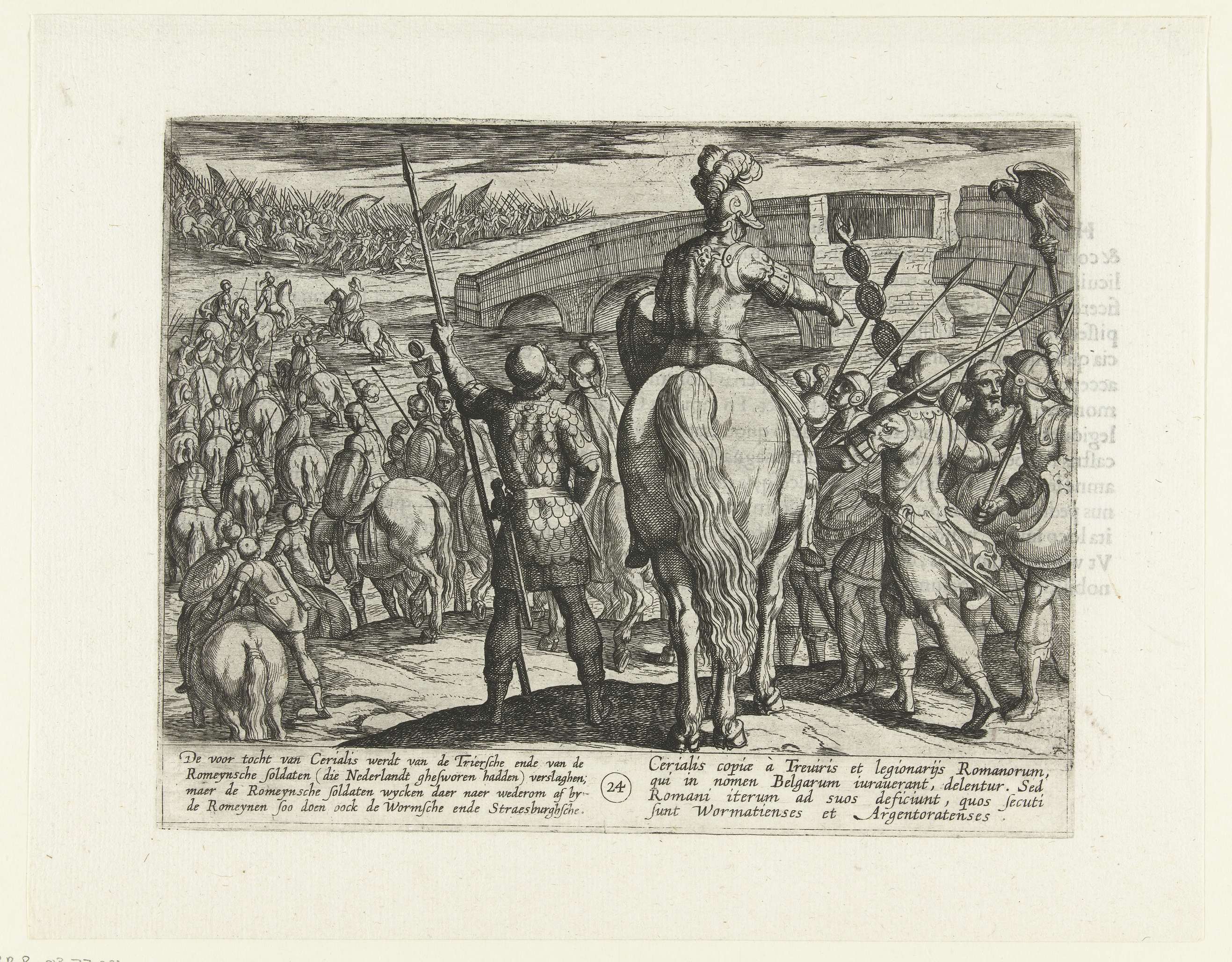 De voorhoede van de nieuwe Romeinse troepen onder bevelhebber Cerialis wordt verslagen, maar velen kiezen nu de zijde van de Romeinen. Prent nummer 24 in de serie prenten over de Bataafse Opstand: Batavorum cum Romanis bellum / à Corn. Tacito lib. IV & V. : Hist. olim descriptum, figuris nunc aeneis expressum, auctore Othone Vaenio ...