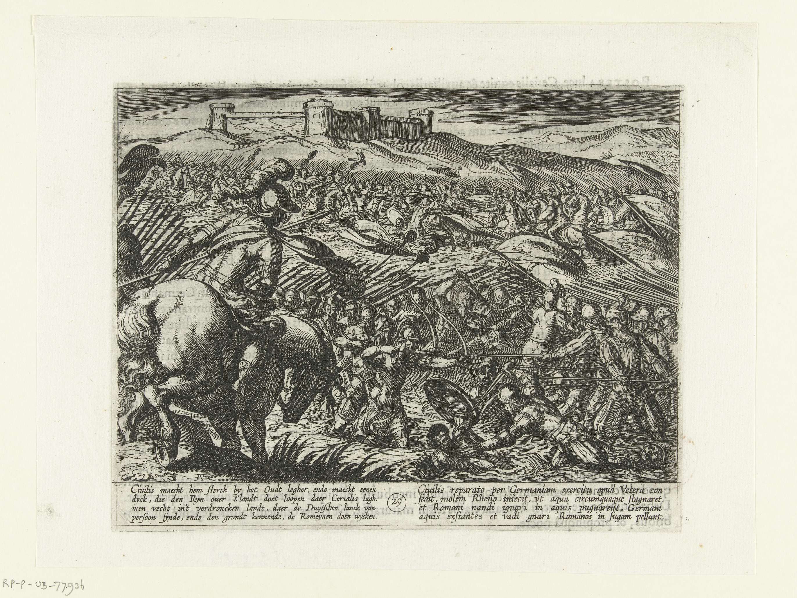 De Bataven strijden tegen de Romeinen op het land dat Civilis onder water heeft laten lopen. Prent nummer 29 in de serie prenten over de Bataafse Opstand: Batavorum cum Romanis bellum / à Corn. Tacito lib. IV & V. : Hist. olim descriptum, figuris nunc aeneis expressum, auctore Othone Vaenio Lugdunobatava = De Batavische oft ...