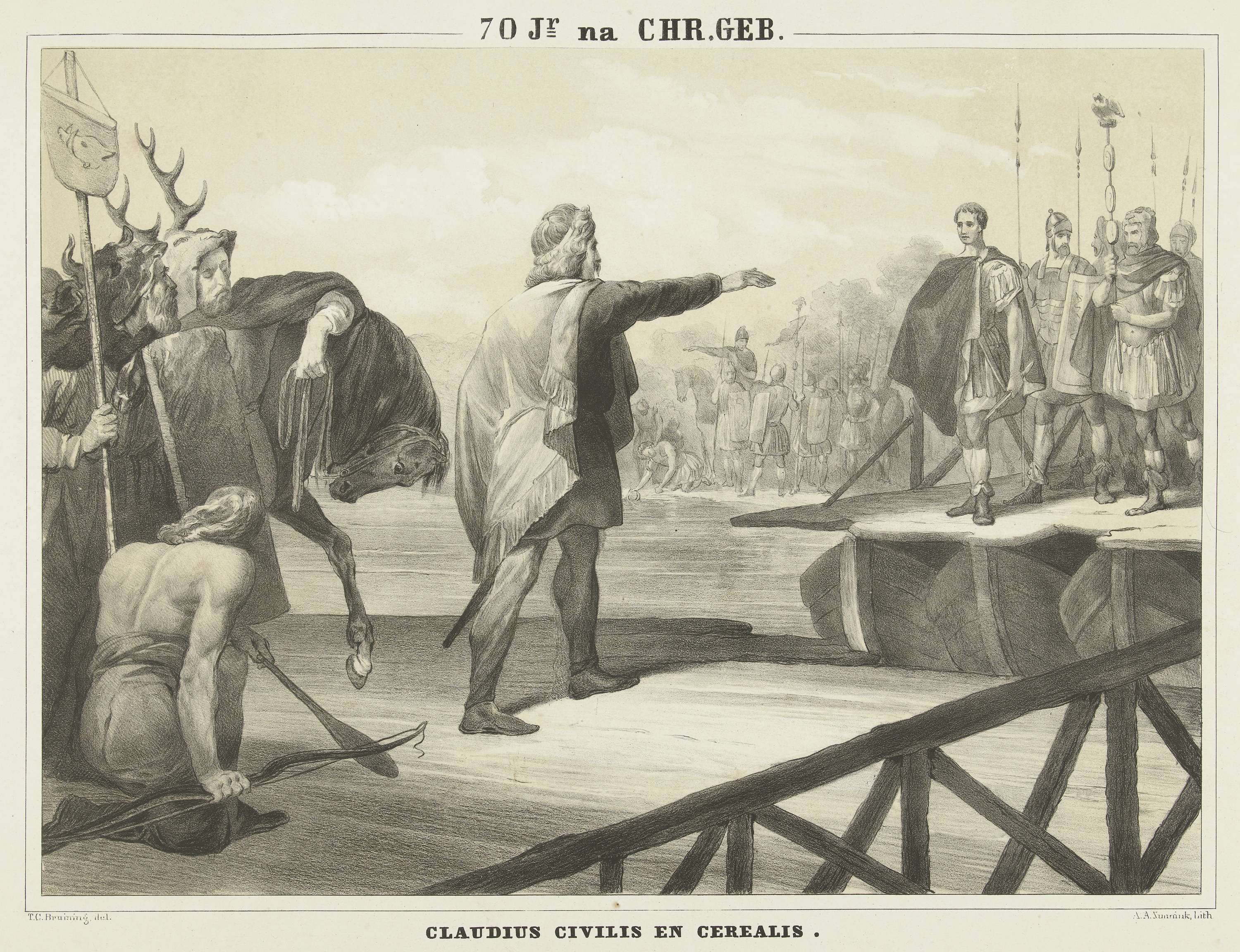 Civilis en Cerialis onderhandelen op de afgebroken brug, 69-70