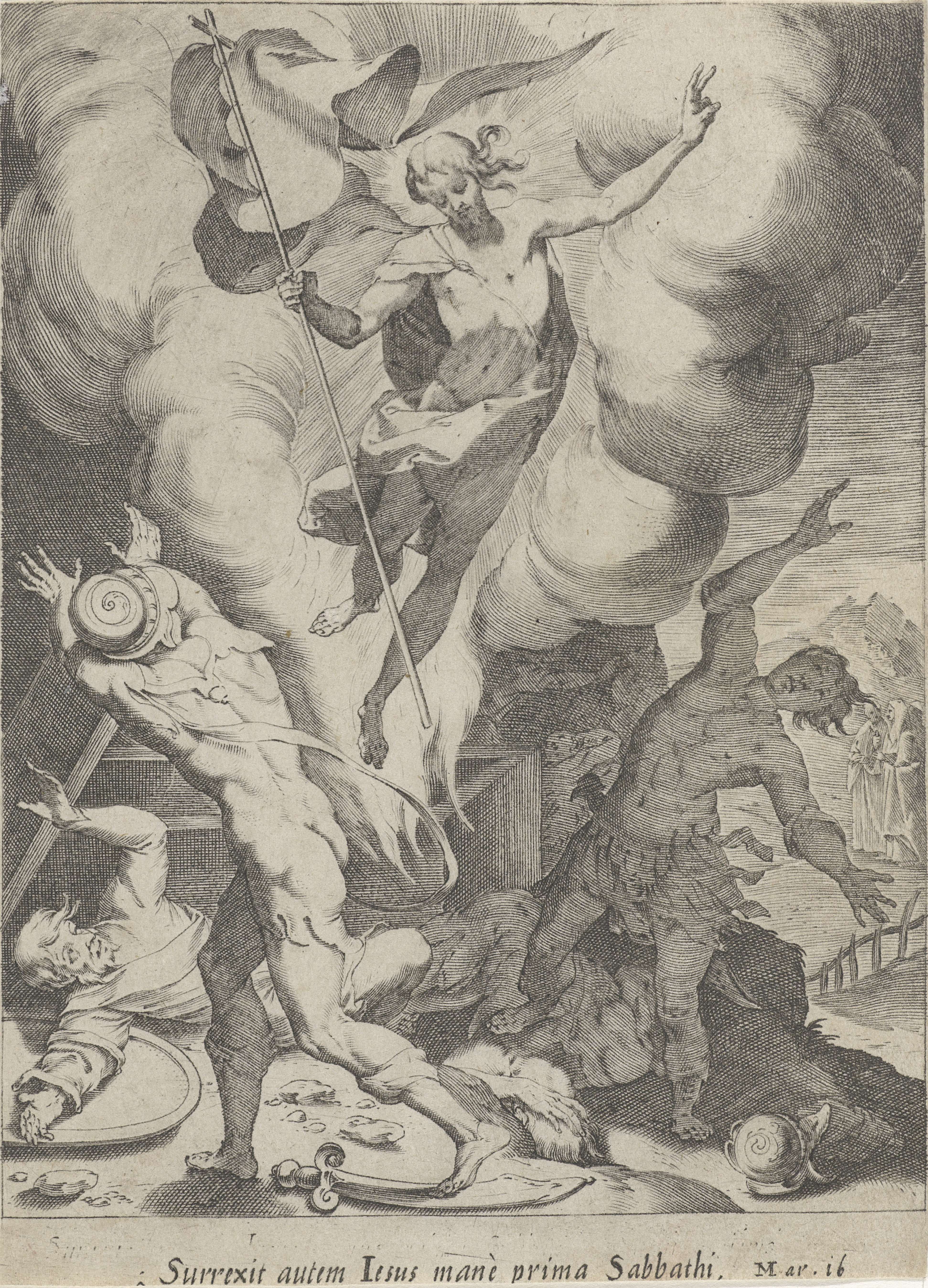 Christus verrijst uit zijn graf. De soldaten die rondom het graf liggen schrikken wakker en vluchten. Rechts op de achtergrond de aankomst van de drie heilige vrouwen bij het graf. In de marge een onderschrift in het Latijn. Prent uit een serie van vijftien met de passie van Christus.