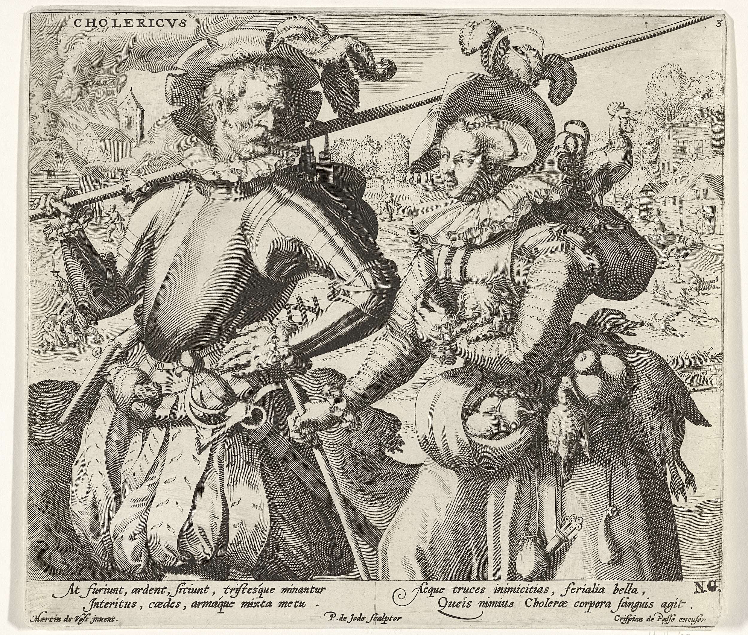 Een soldaat wordt vergezeld door een vrouw, met een hond op haar arm. Om haar middel hangt een doek met groenten en aan haar riem hangen dode vogels. Op het pakket op haar rug zit een haan. Op de achtergrond een brandende kerk en een man die ganzen verjaagt. In de marge, in twee kolommen, ...