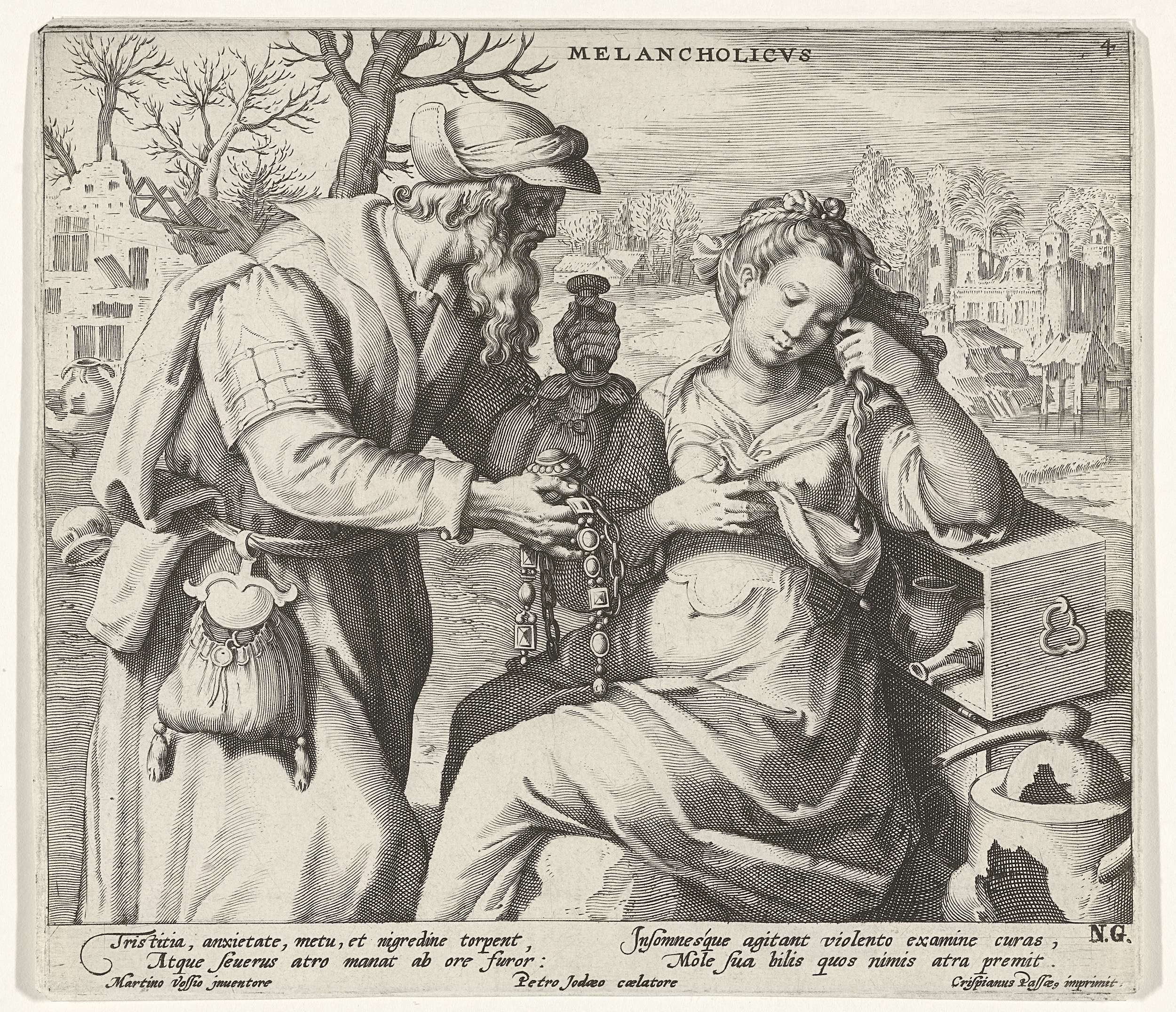 Landschap met een jonge vrouw, met neergeslagen ogen, leunend op een kistje. Een oude man biedt haar juwelen en een stokkenbeurs vol geld aan. In de marge, in twee kolommen, een onderschrift in het Latijn. Vierde prent uit een serie van vier met de vier temperamenten.