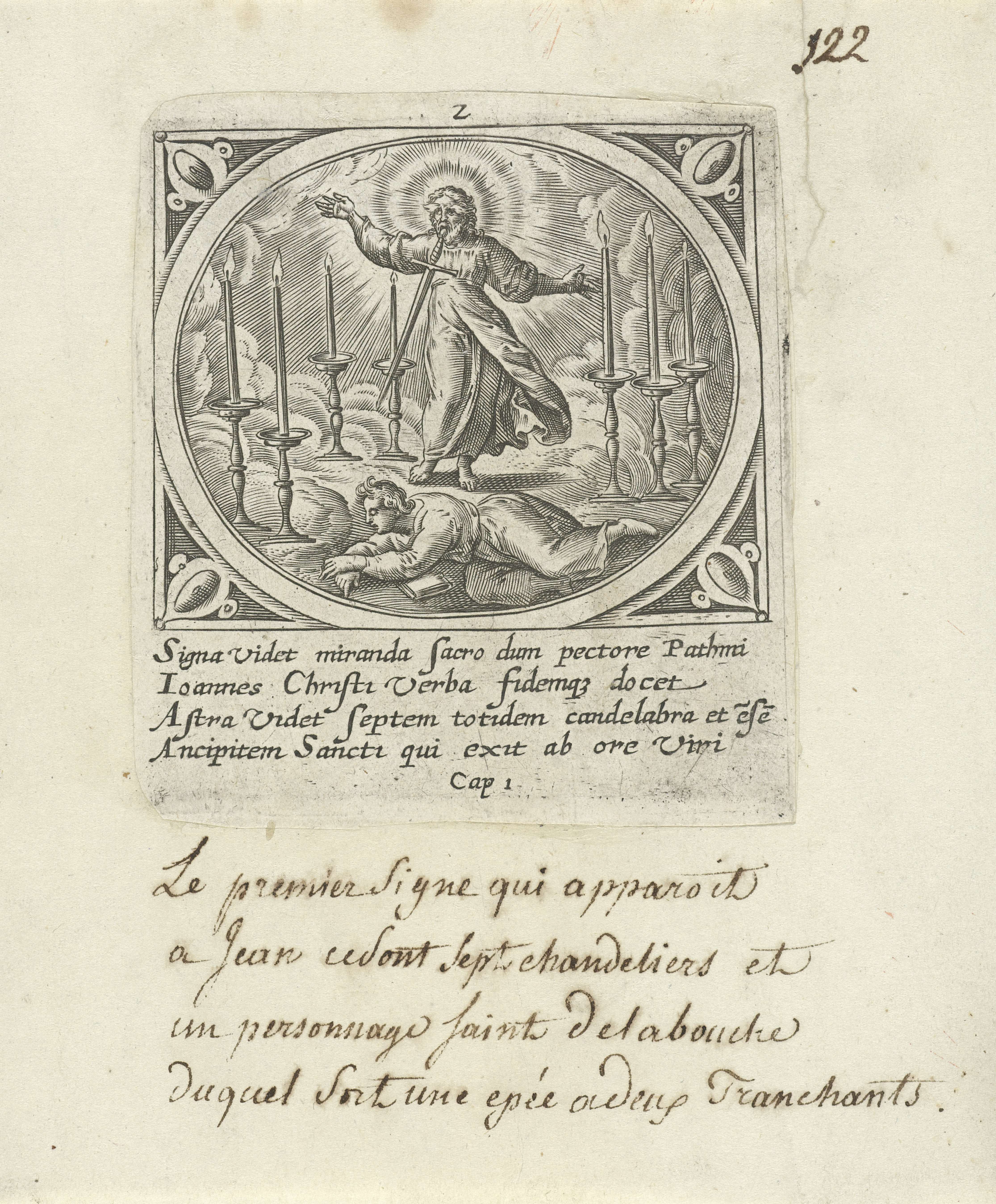 Christus, in de wolken tussen zeven kandelaars, verschijnt aan Johannes. Uit de mond van Christus komt een zwaard. Johannes ligt, met een boek naast zich, op de grond. In de marge een vierregelig onderschrift in het Latijn. Tweede prent uit een serie van vierentwintig met de openbaring van Johannes op Patmos.