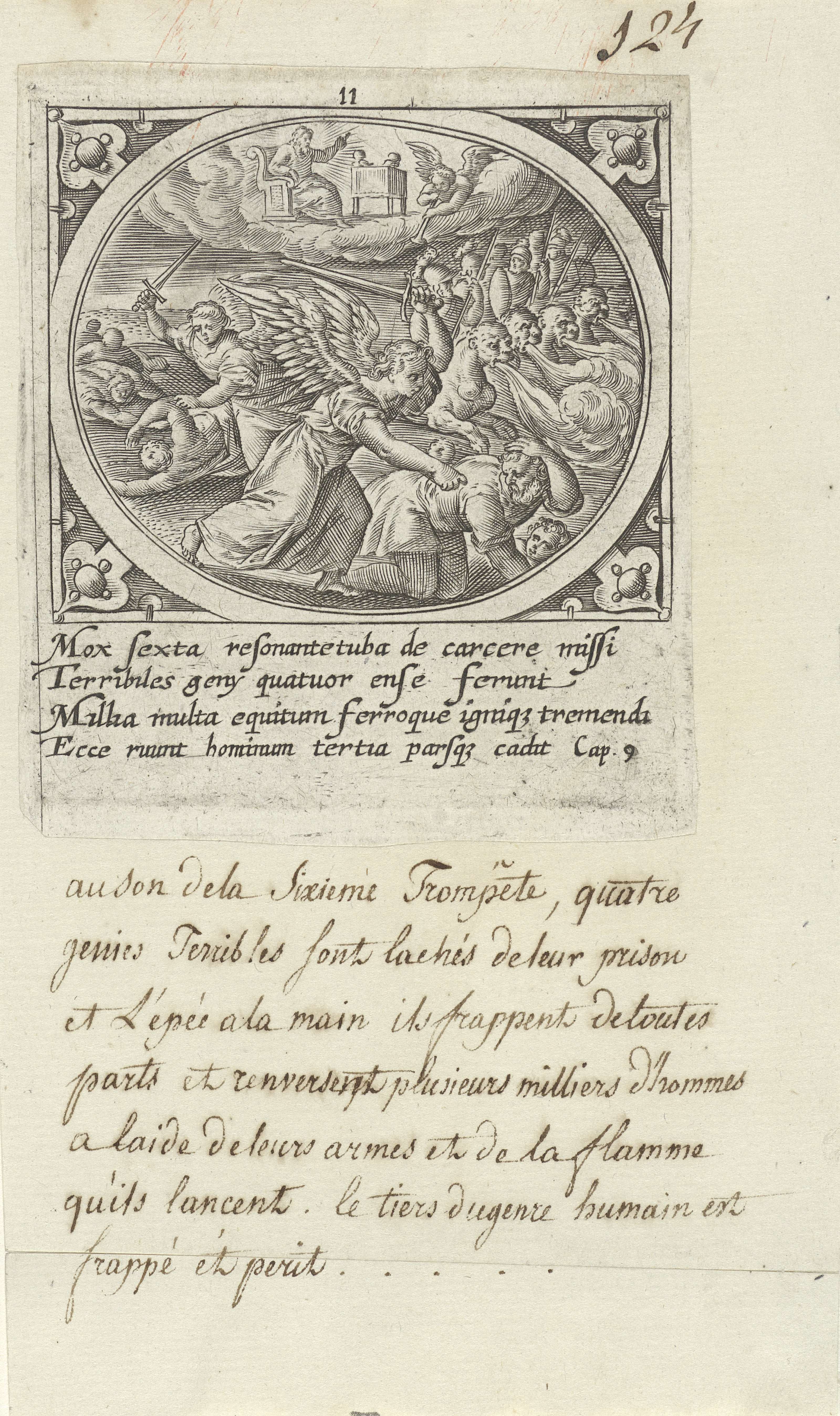 De zesde engel blaast op de bazuin. Naast de engel zit God de Vader op zijn troon en staat het gouden altaar met de vier horens waar een stem uitkomt die opdraagt dat de vier engelen die gevangen zitten moeten worden bevrijd. De engelen en de ruiters op paarden met leeuwenkoppen roeien een derde van ...