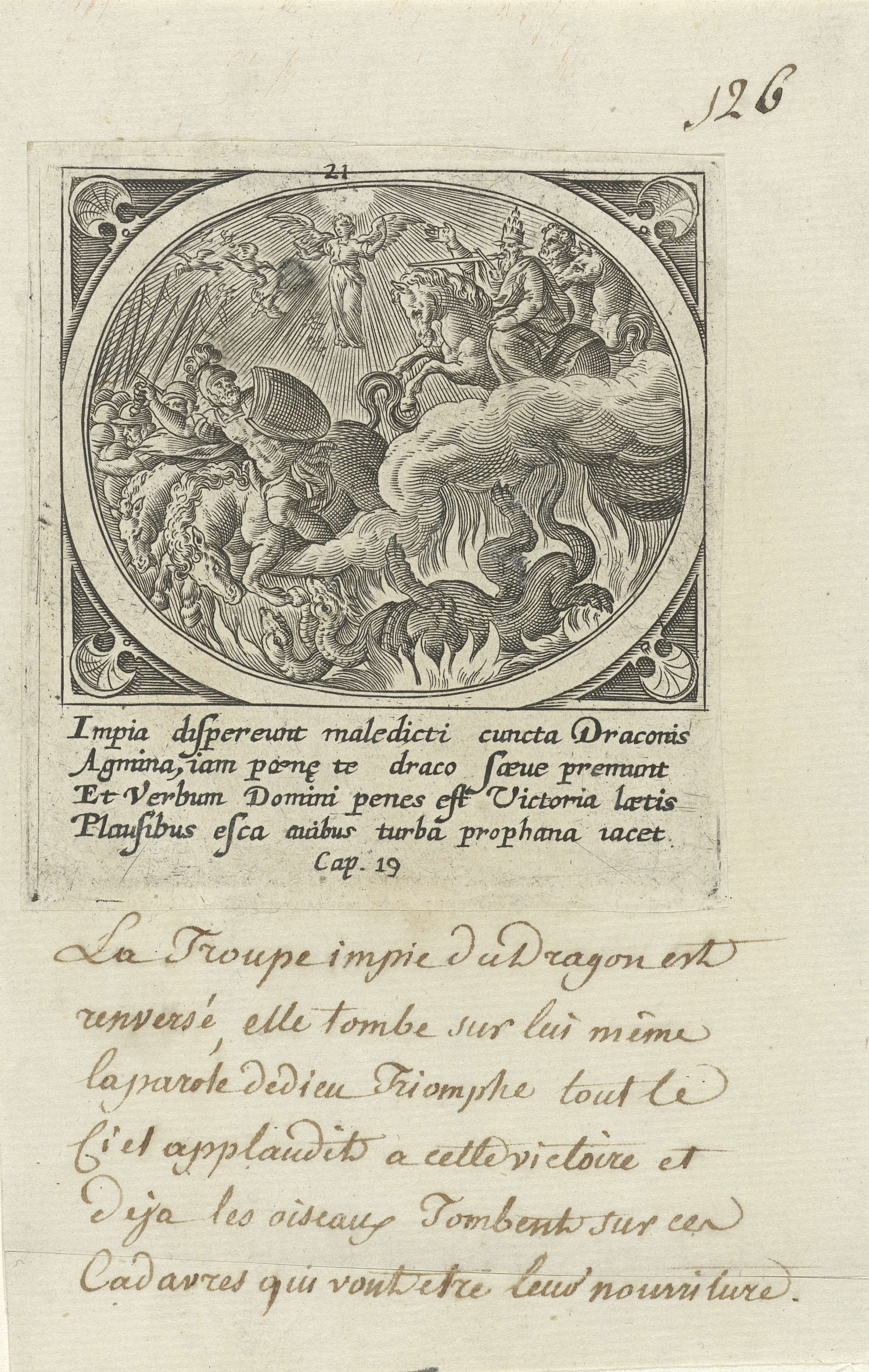 Een engel staat midden in de zon en roept naar de vogels. Het hemelse leger, aangevoerd door een ruiter met pauselijke mijter en een zwaard in zijn mond, strijdt tegen het aardse leger. Het beest gaat ten onder in een vuurpoel. In de marge een vierregelig onderschrift in het Latijn. Eenentwintigste prent uit een serie ...