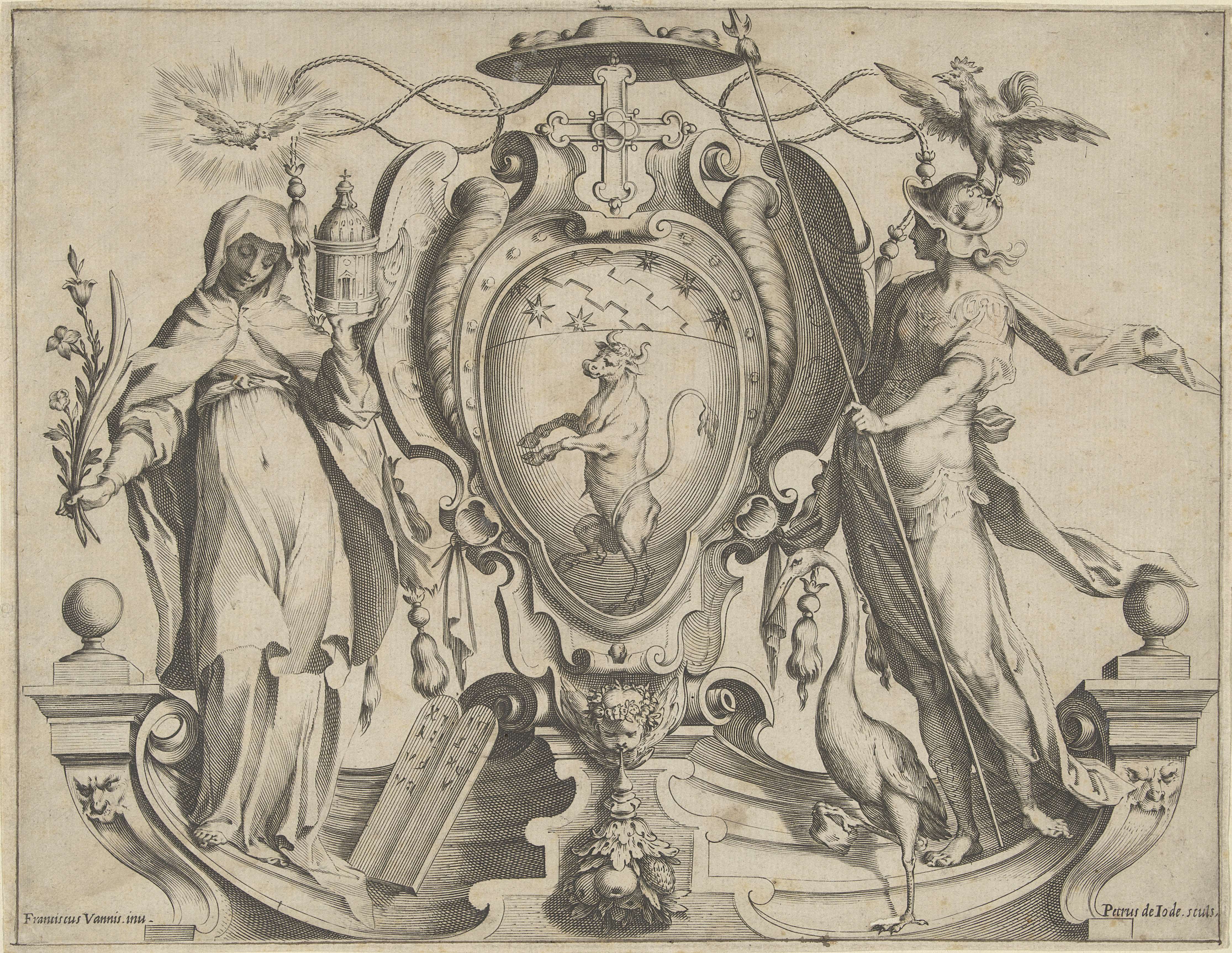 Wapenschild met stier en vrouwelijke personificaties