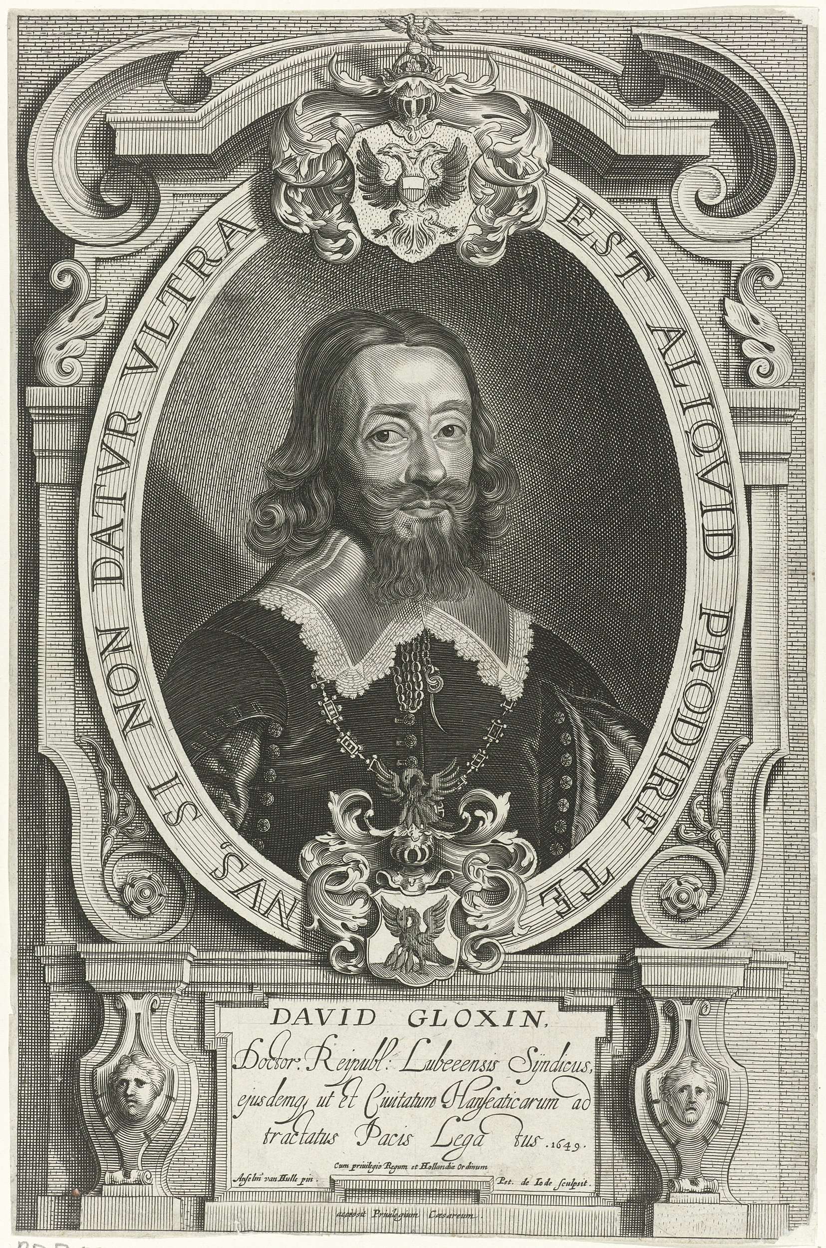Busteportret van David Gloxin, met ambtsketen. Het portret is gevat in een ovale omlijsting met het wapenschild van de geportretteerde en een randschrift in het Latijn. In het kader een vierregelig onderschrift in het Latijn. Prent uit een serie portretten naar schilderijen van Anselmus van Hulle van alle gedelegeerden bij de vredesonderhandelingen te Münster en ...