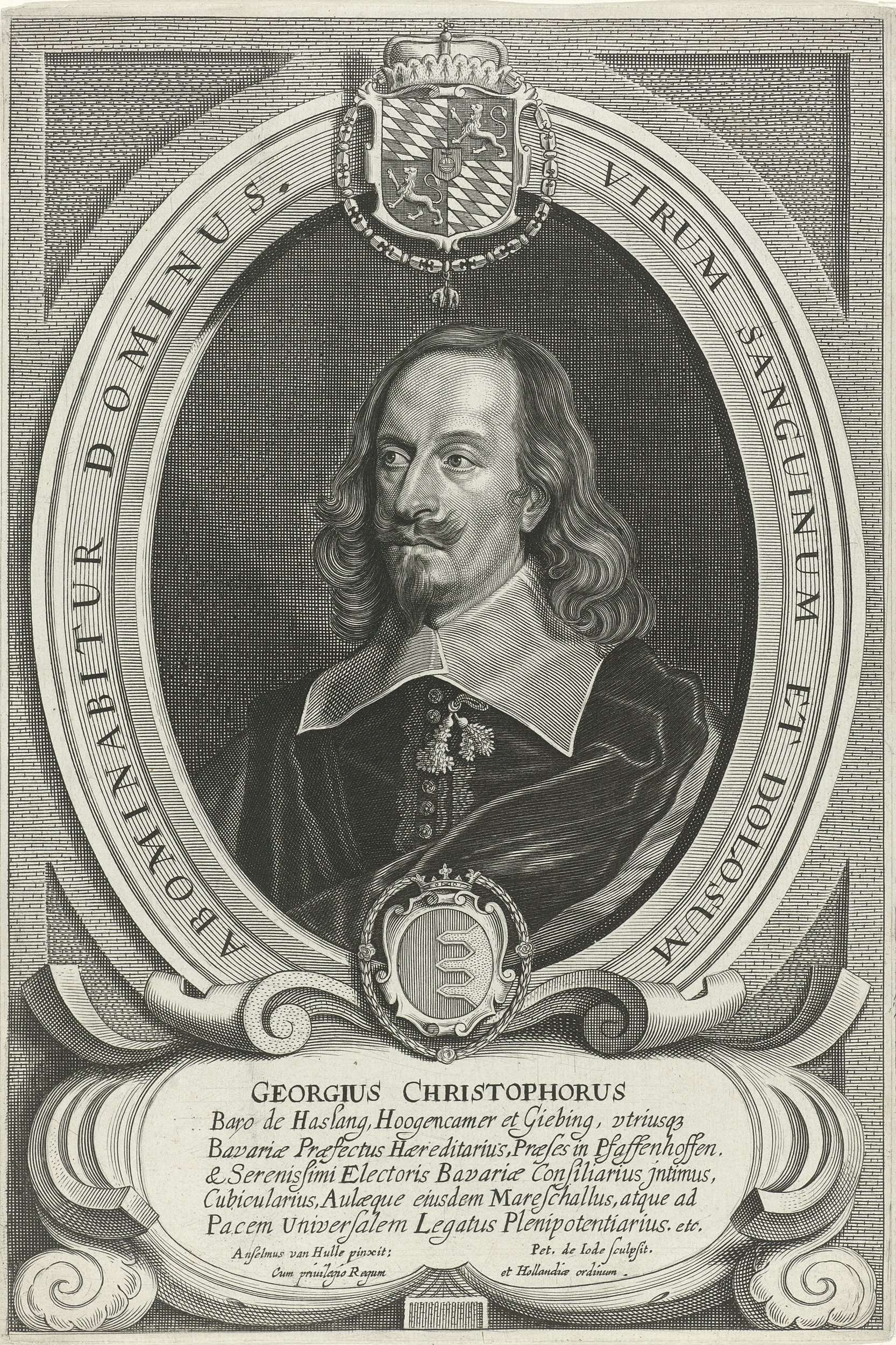 Busteportret van Georg Christoph, baron van Haslang. Het portret is gevat in een ovale omlijsting met het wapenschild van de geportretteerde, een keten met de Orde van het Gulden Vlies en een randschrift in het Latijn. In de cartouche een zesregelig onderschrift in het Latijn. Prent uit een serie portretten naar schilderijen van Anselmus van ...