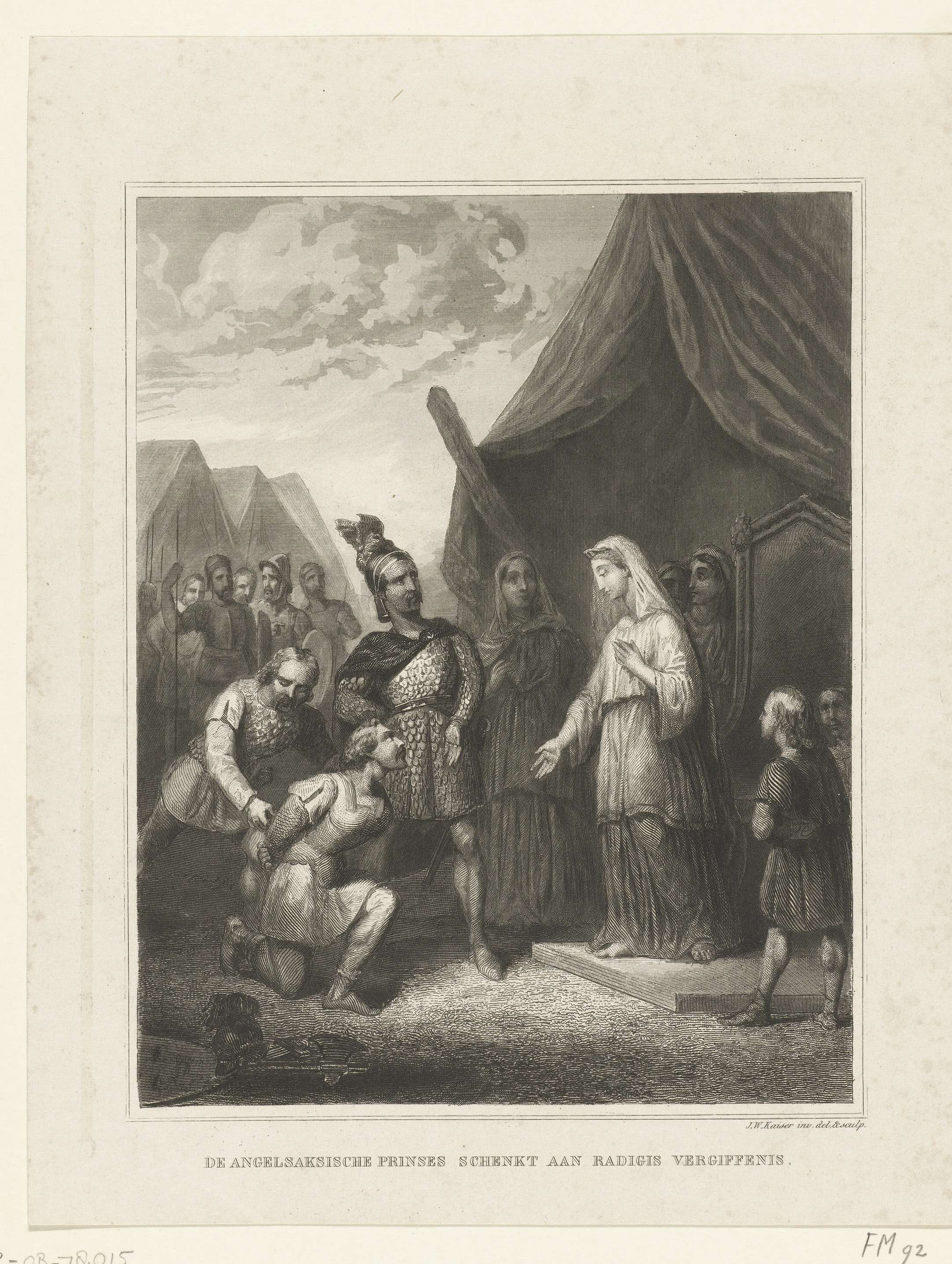 Zijn Angelsaksische bruid schenkt Radagijs, koning van Warmond, in het jaar 534 vergiffenis na hem met haar legers te hebben verslagen.