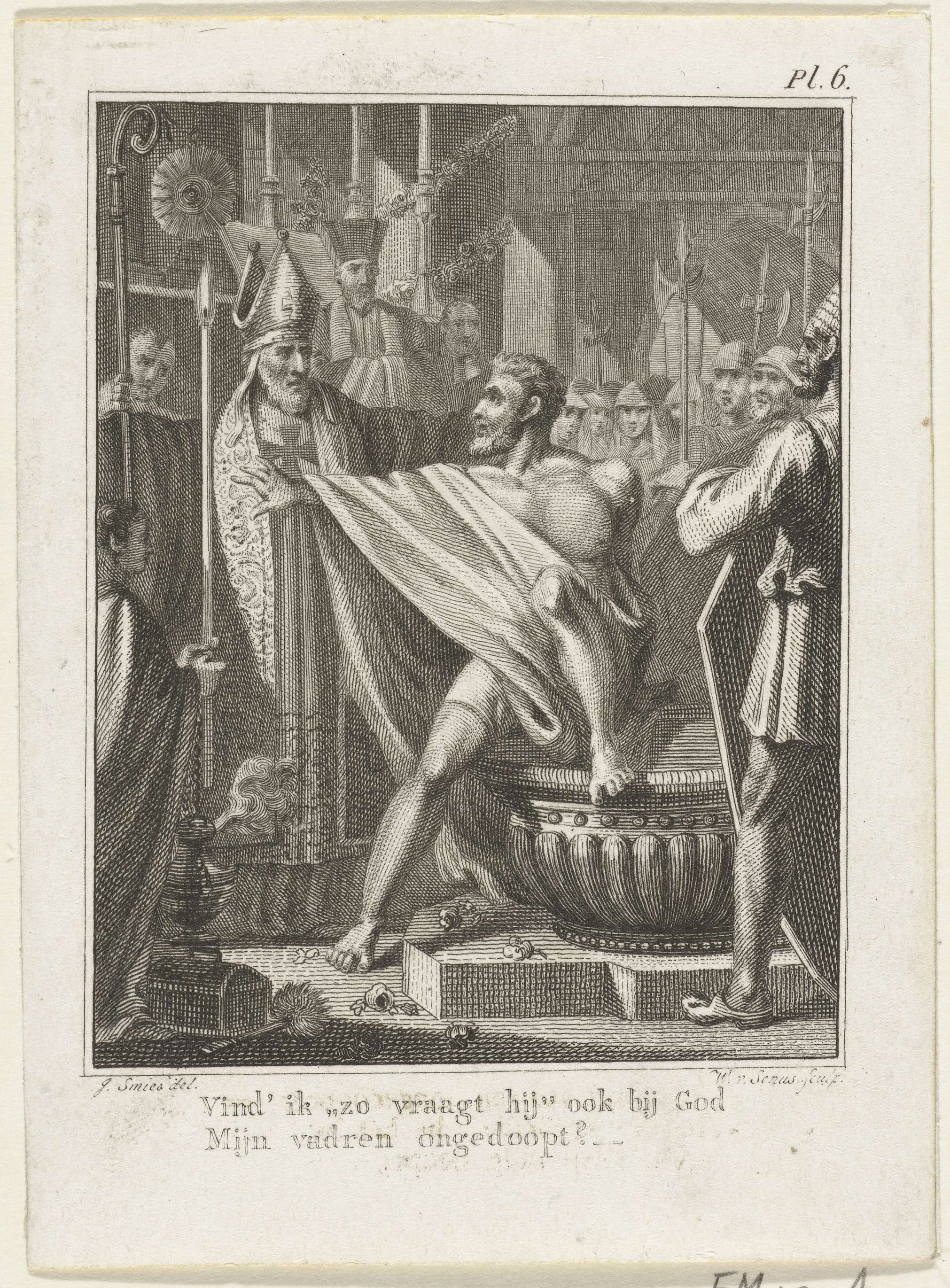 Radbod, koning der Friezen, weigert zich in 719 door bisschop Wulfram van Sens te laten dopen. Radbod staat met één been in de rand van het doopvont. Onder de voorstelling het onderschrift: Vind' ik "zo vraagt hij" ook bij God Mijn vadren ongedoopt?