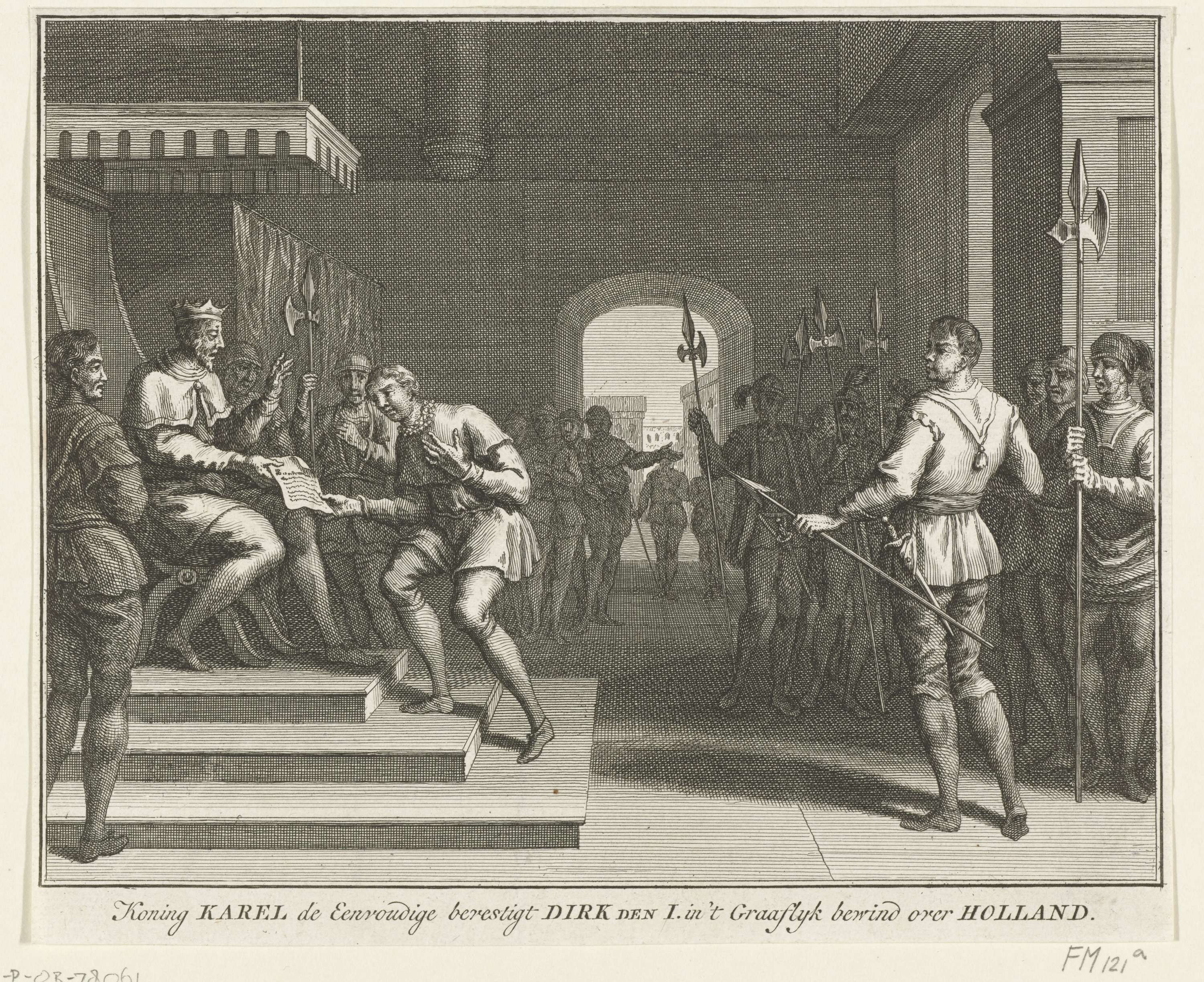 Karel de Eenvoudige verleent Dirk I de titel graaf van Holland, 922