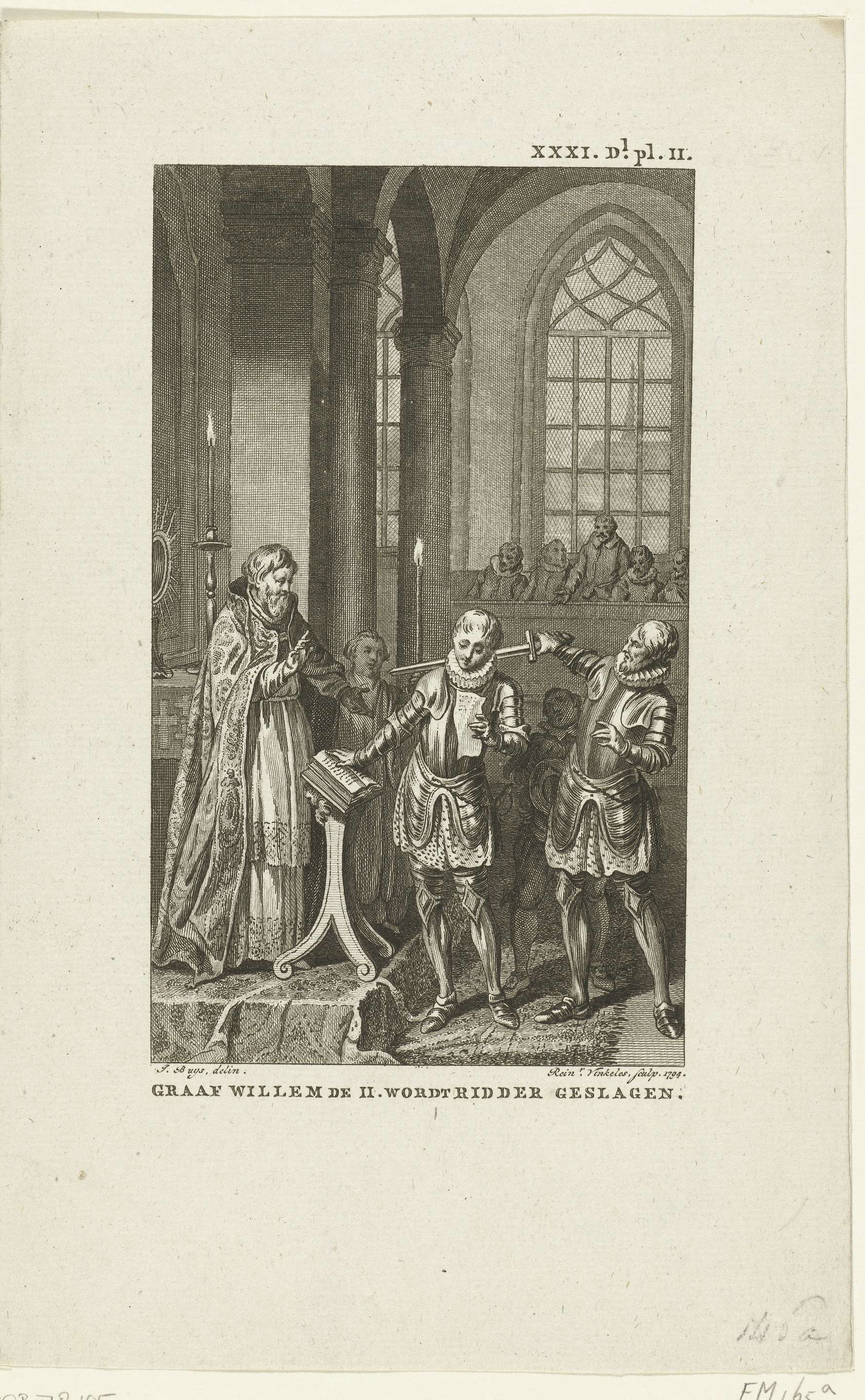 Graaf Willem II wordt in 1248 te Keulen tot ridder geslagen. Kerkinterieur waarin de graaf staande voor het altaar met zijn hand op de bijbel zijn gelofte als ridder aflegt. De bisschop zegent hem, een andere ridder houdt een zwaard op zijn schouder.
