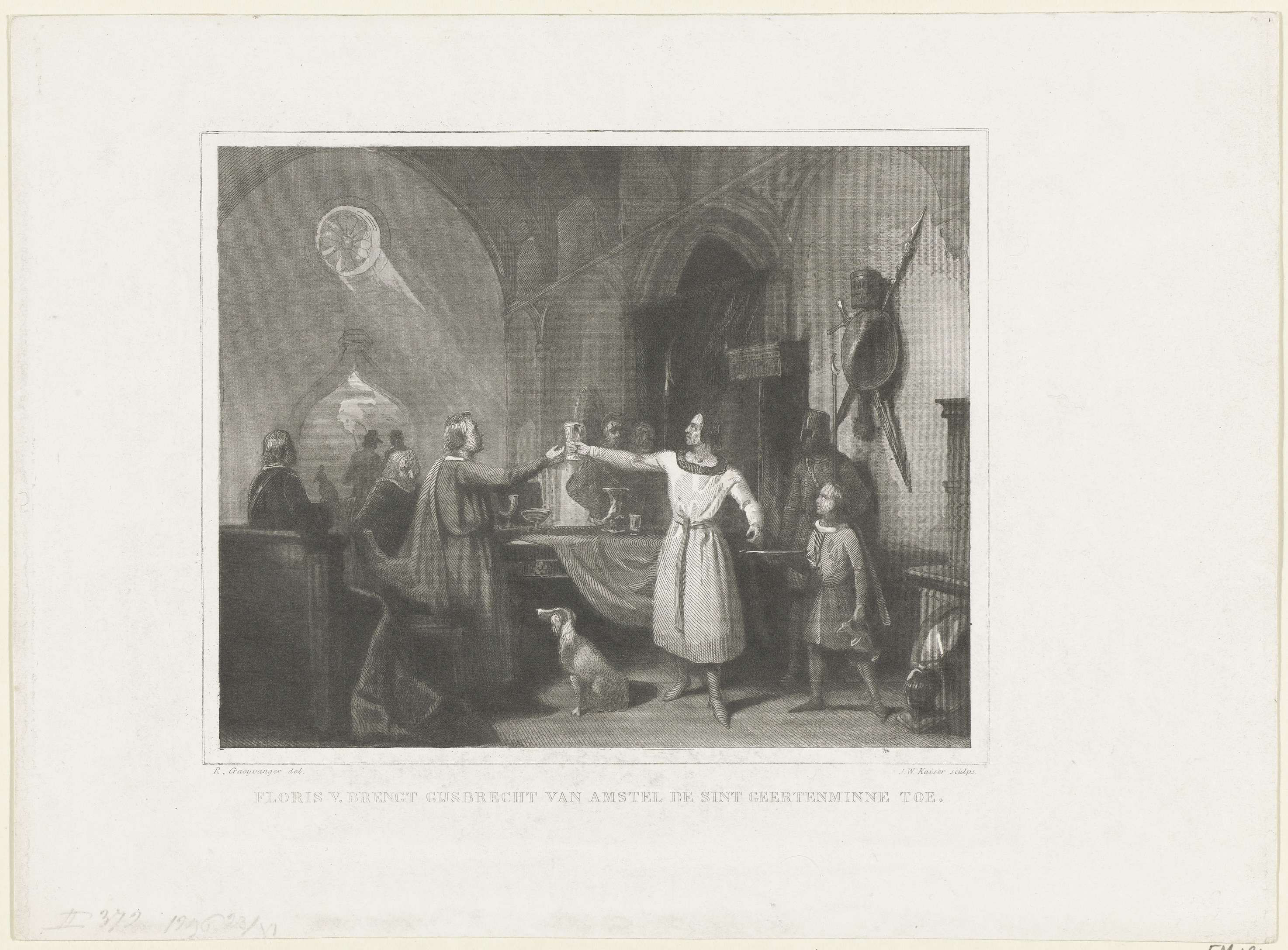 De Geertens-Minnedronk door Floris V kort voor vertrek ter jacht en dood uitgebracht aan Gijsbrecht van Amstel, 1296. Staande naast een tafel in de hal van een kasteel met wapenrusting aan de muur.