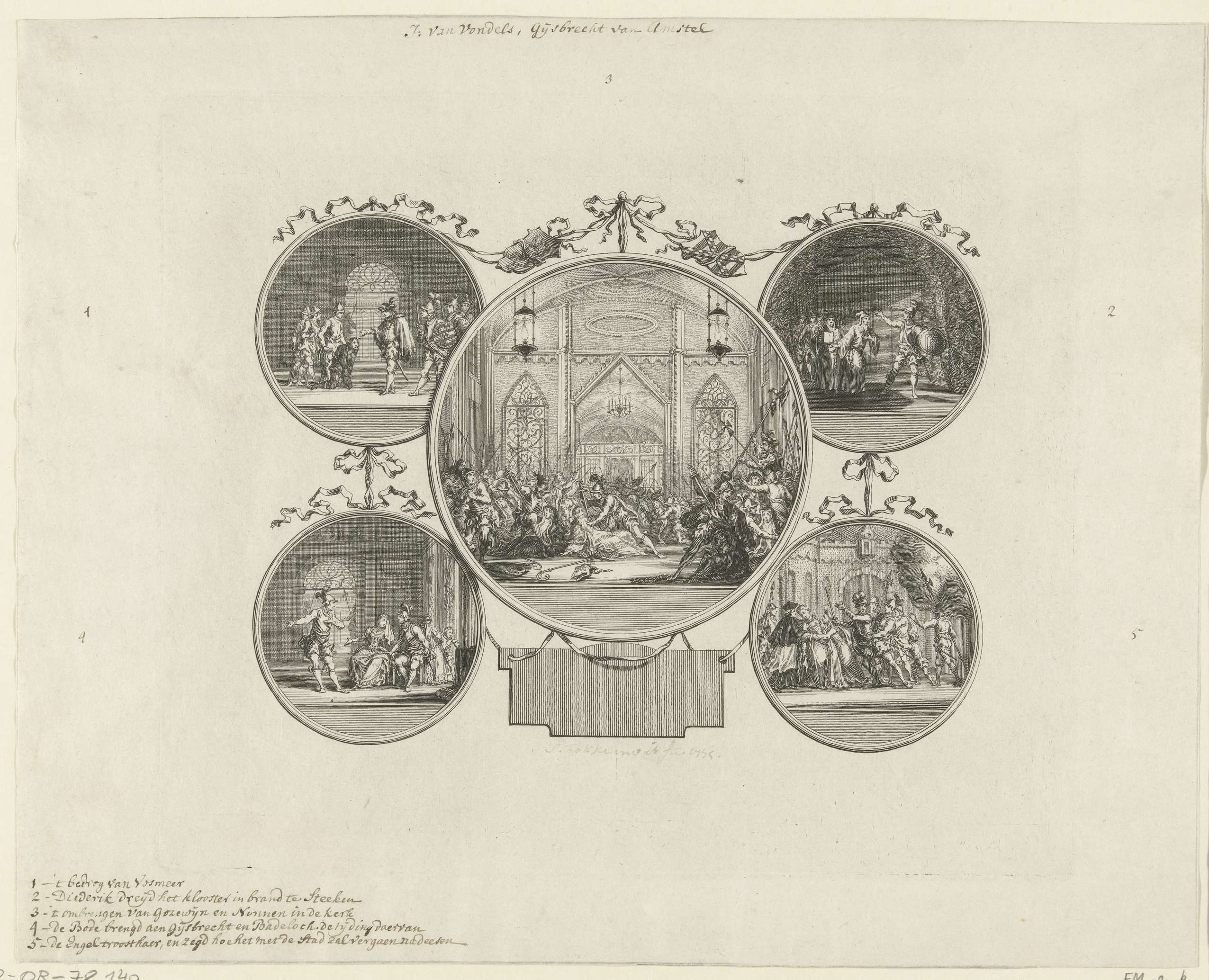 Blad met vijf toneelscènes in ronde medaillons uit het toneelstuk Gijsbrecht van Amstel van Joost van den Vondel. Centraal een grote ronde voorstelling omringd door vier kleine ronden.