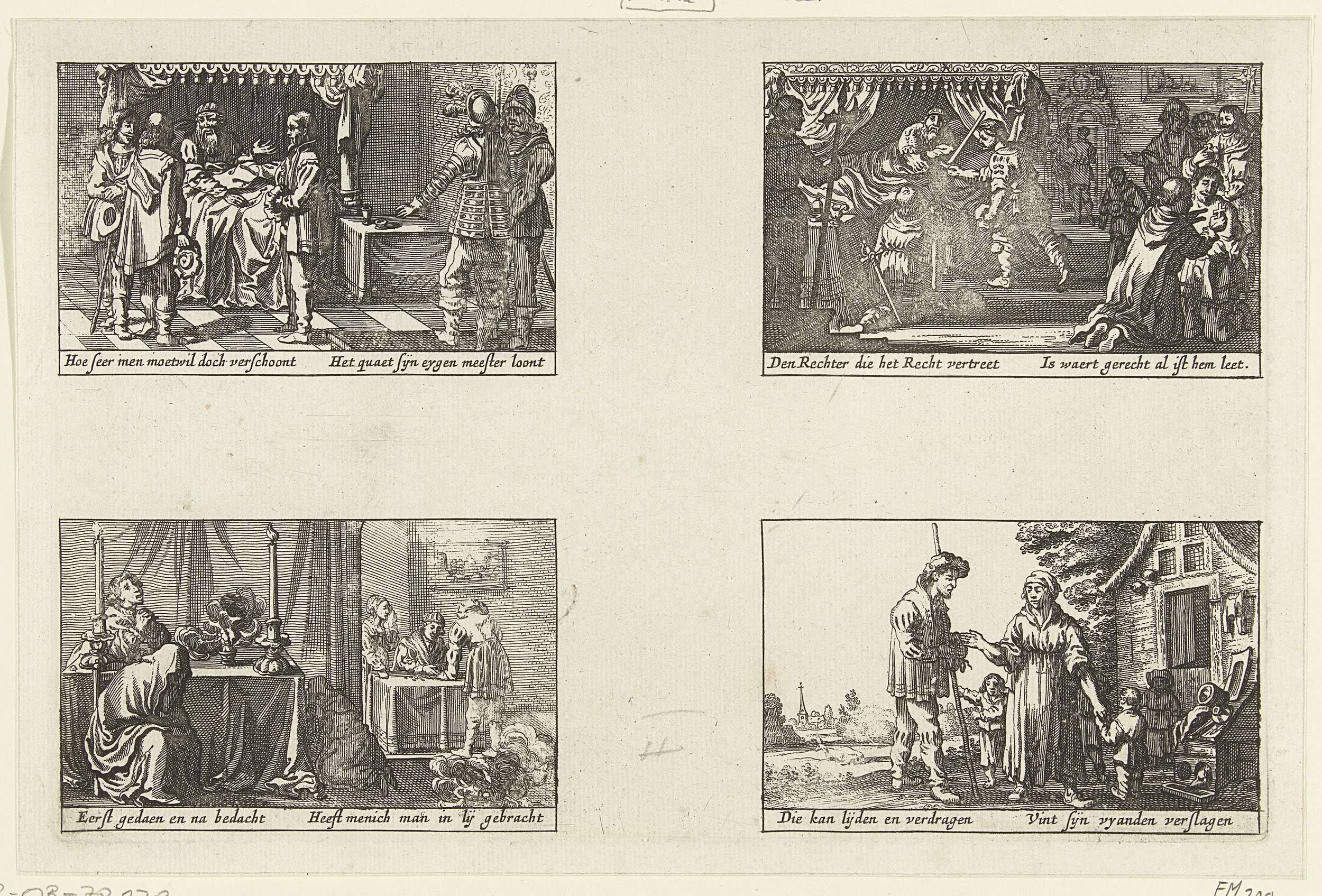 De laatste vier episoden uit de Rechtspraak van graaf Willem III. Vier afzonderlijke scènes samen op één blad gedrukt. Onder elke prent een spreuk.