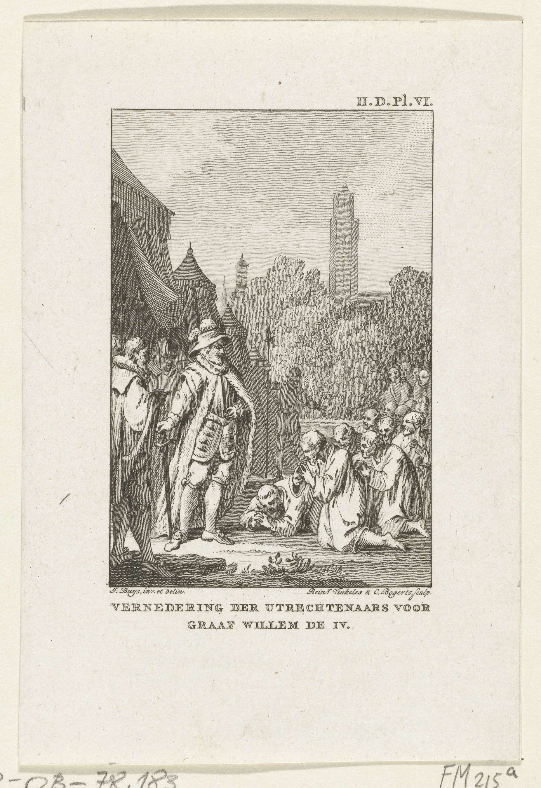 Burgers van Utrecht smeken blootshoofds en blootsvoets graaf Willem IV hun stad vrede te geven, november 1345. De graaf ontvangt de burgers staande voor zijn tent, op de achtergrond de stad Utrecht en de Dom.