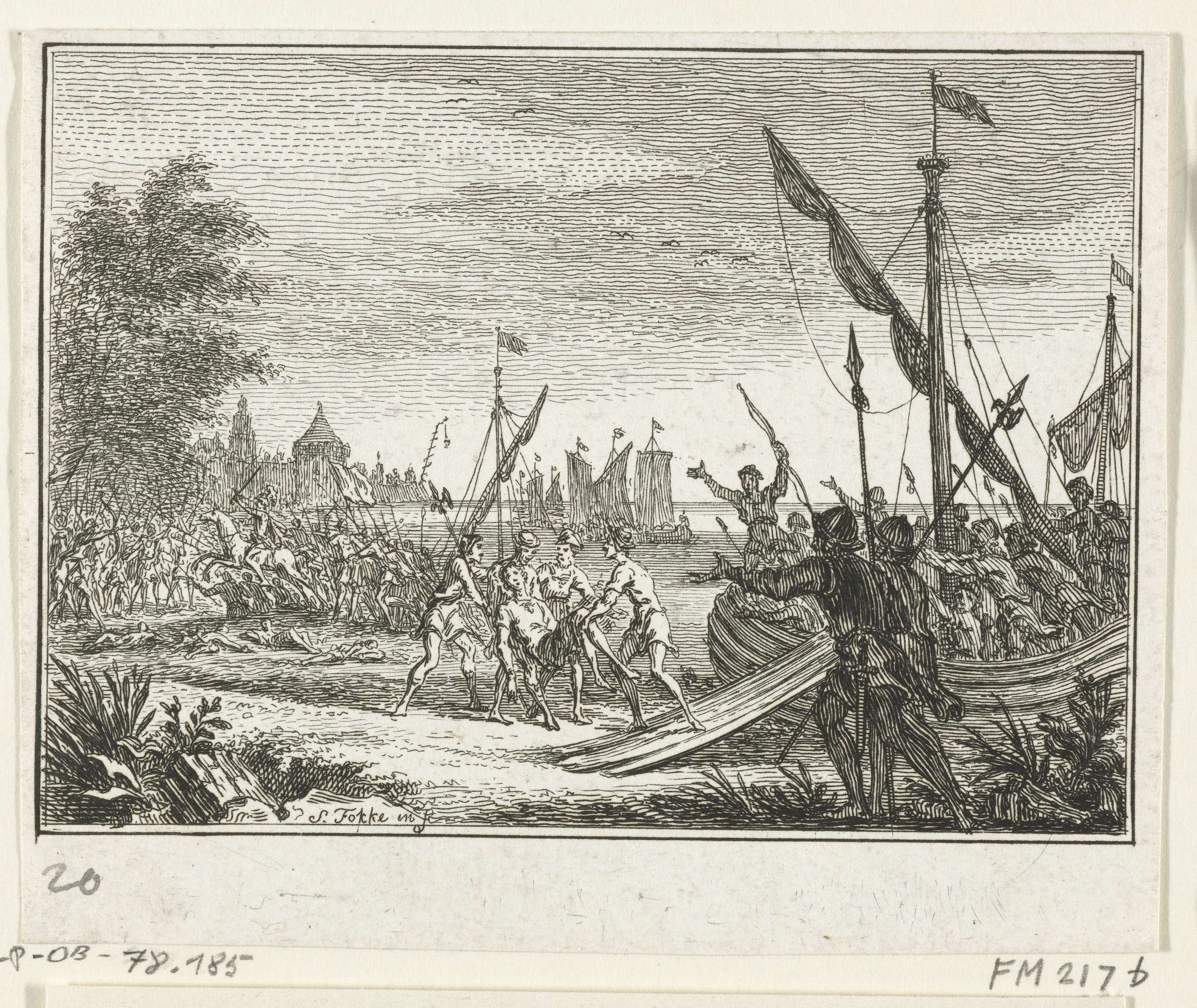 Graaf Willem IV van Holland en Henegouwen wordt door de Friezen gedood in een hinderlaag bij Stavoren, 26 september 1345. Op de achtergrond het gevecht waarbij de graaf sneuvelt, op de voorgrond wordt het lichaam van de graaf door zijn soldaten naar een boot gedragen.