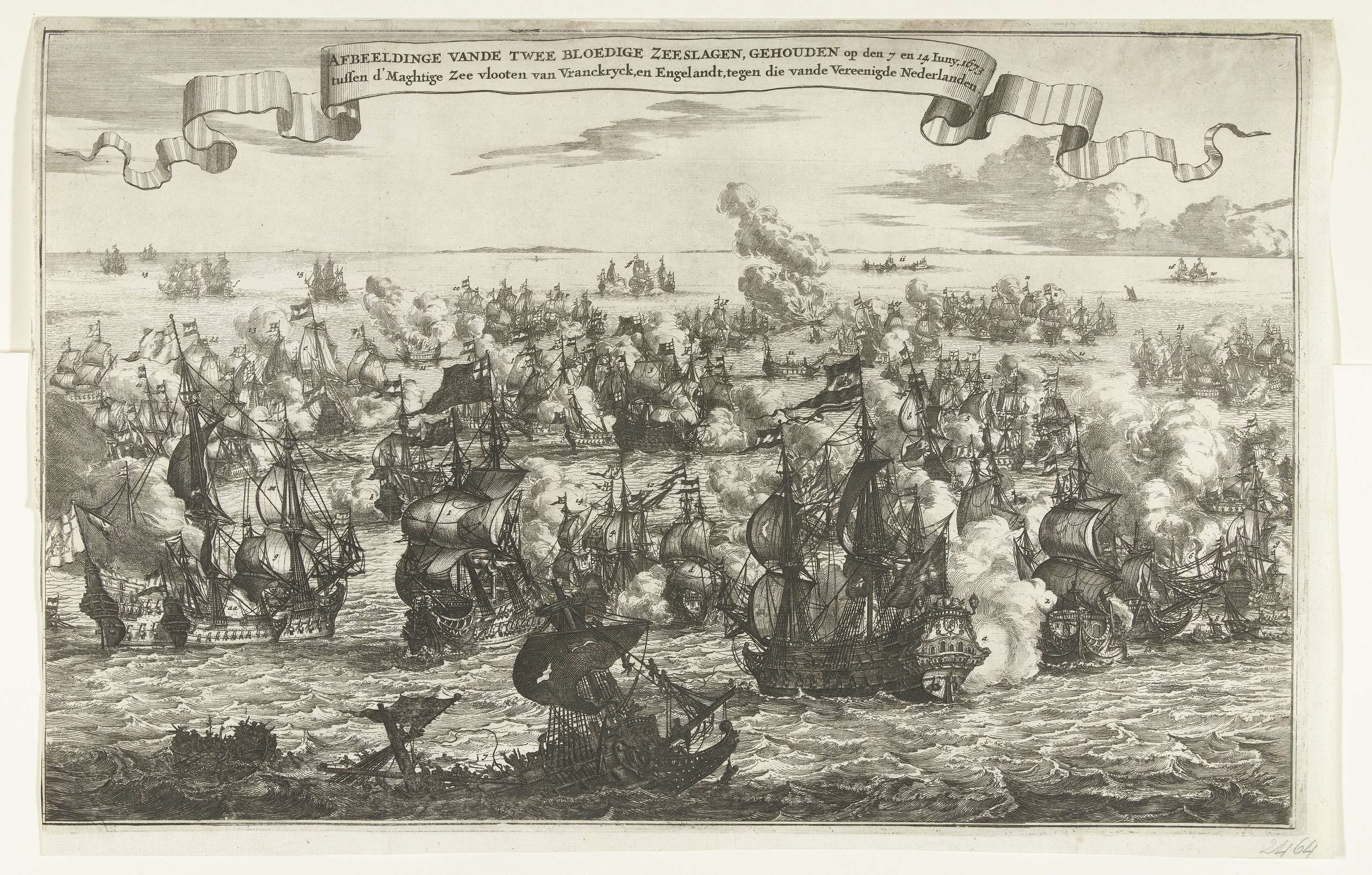 Gecombineerde voorstelling van de twee zeeslagen voor de Zeeuwse kust op de vlakte van Schoonevelt op 7 juni en 14 juni tussen de vloot van de Republiek onder admiraal Michiel Adriaenszoon de Ruyter en vice-admiraal Cornelis Tromp en de gecombineerde Engels-Franse vloot onder Prins Rupert en graaf Jean d'Estrées. Bij de prent behoort een tekstblad ...