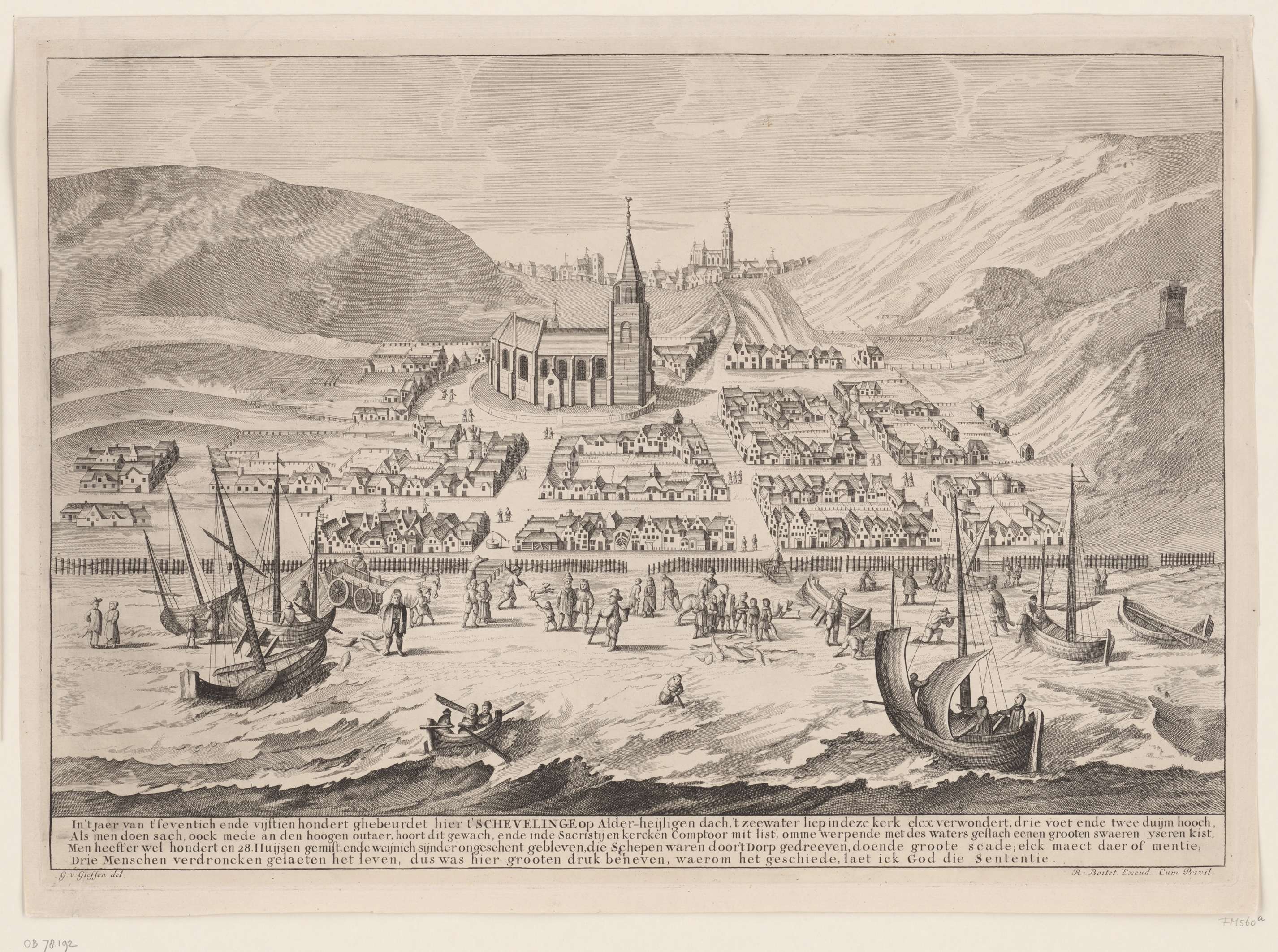 Gezicht op het dorp Scheveningen voordat het getroffen werd door een stormvloed op Allerheiligen, 1 november 1570. Hierbij werden 128 huizen verwoest en verdronken drie personen. Op de voorgrond de zee en het strand. Daarachter het dorp, gelegen tussen de duinen, met in het midden de kerk. Op de achtergrond Den Haag. Met een vierregelig ...