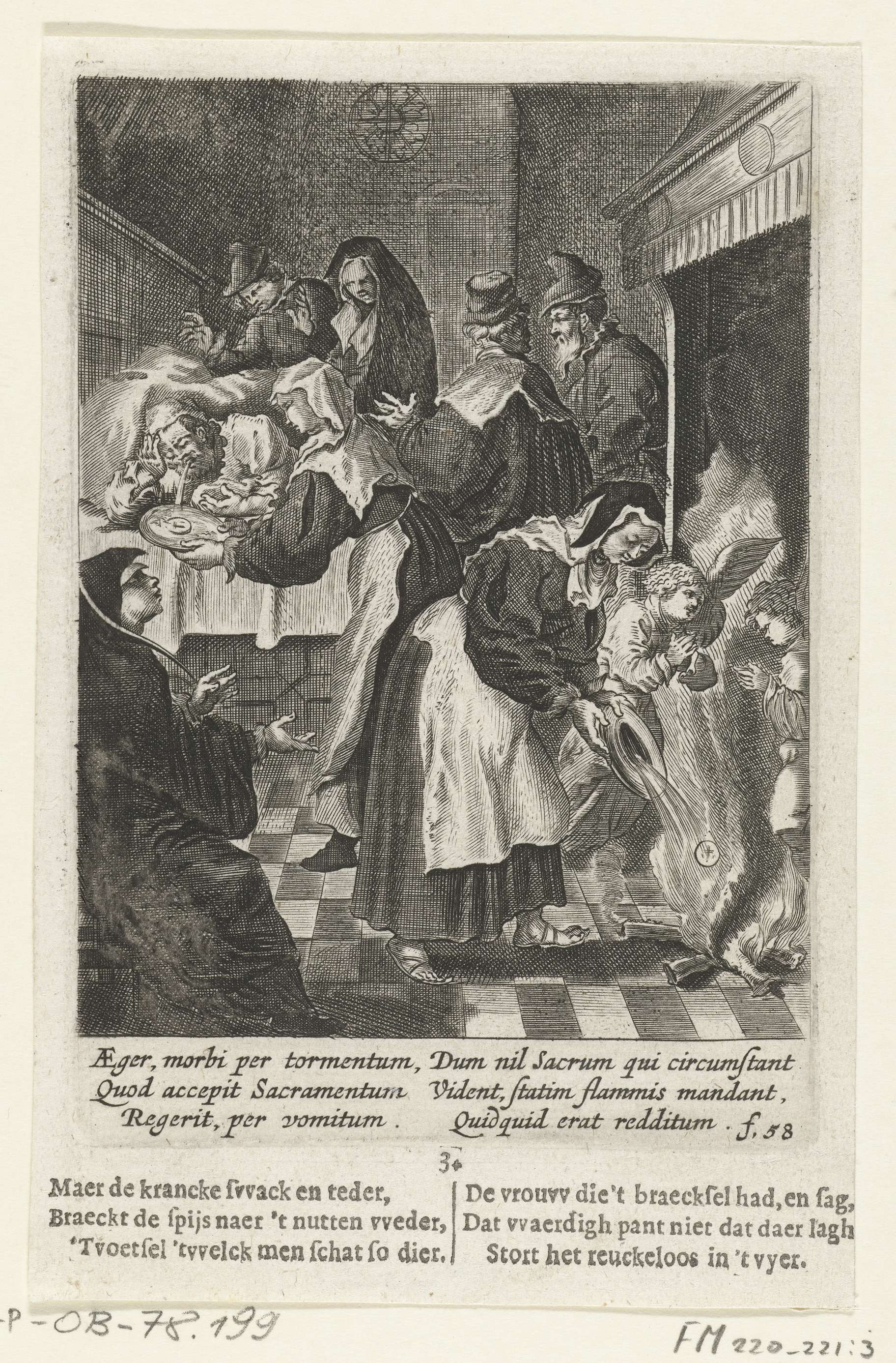 De zuster werpt het braaksel met de hostie in het vuur van de haard, links. In het vuur verschijnen twee engelen, op de achtergrond braakt de zieke de hostie uit. Prent nr. 3 uit de serie van 16 voorstellingen van Het Mirakel van Amsterdam, naar de gebeurtenissen op 15 maart 1345. Kopieën naar de reeks ...