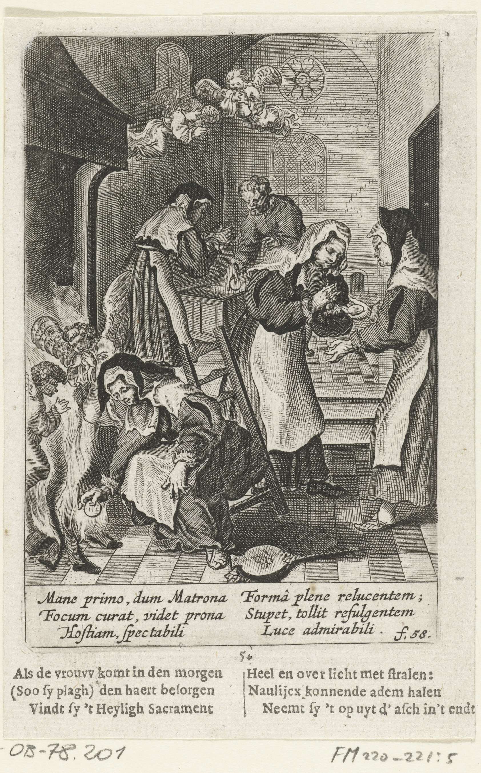 De vrouw raapt de ongeschonden hostie uit het vuur, op de achtergrond toont zij de hostie en wordt het in een kist opgeborgen. Prent nr. 5 uit de serie van 16 voorstellingen van Het Mirakel van Amsterdam, naar de gebeurtenissen op 15 maart 1345. Kopieën naar de reeks van Bolswert. Onder de voorstelling in de ...