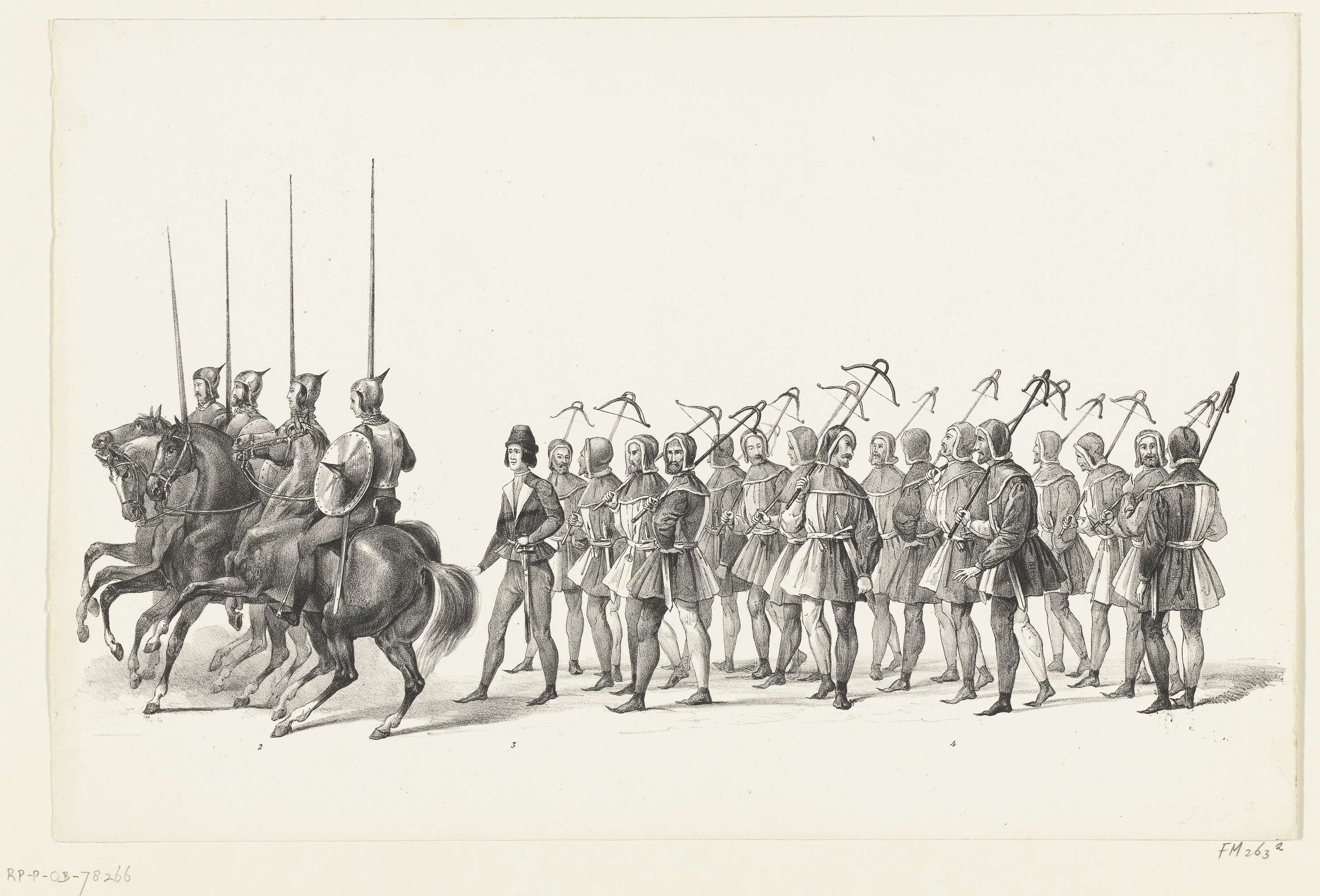 Optocht nrs 2-4: ruiters en boogschutters. Onderdeel van de prentserie van de Maskerade van de intocht van hertog Jan van Beieren te Leiden op 18 augustus 1420 door de Leidse studenten op 8 februari 1840.
