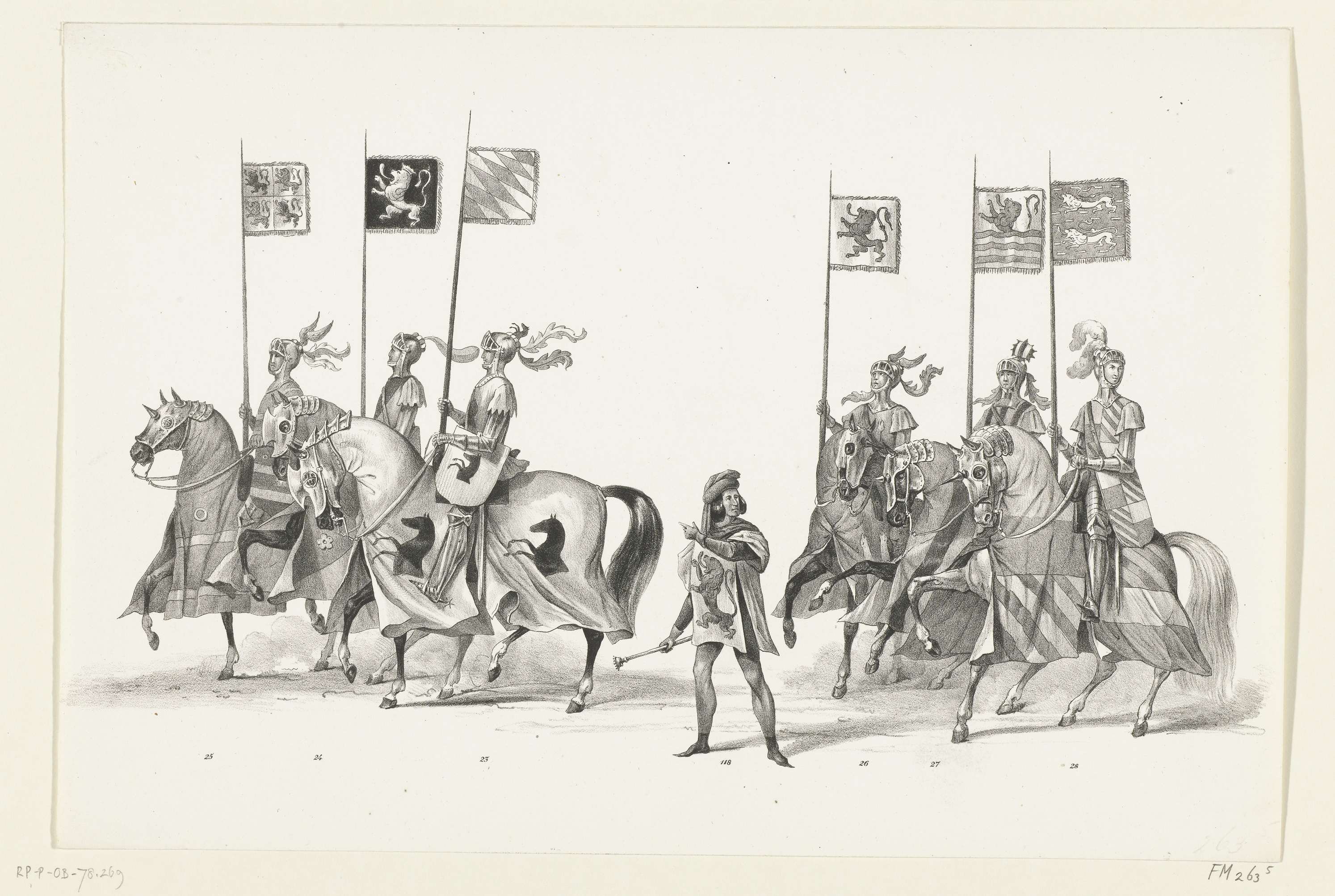 Optocht nrs 25-28: ridders met banieren. Onderdeel van de prentserie van de Maskerade van de intocht van hertog Jan van Beieren te Leiden op 18 augustus 1420 door de Leidse studenten op 8 februari 1840.