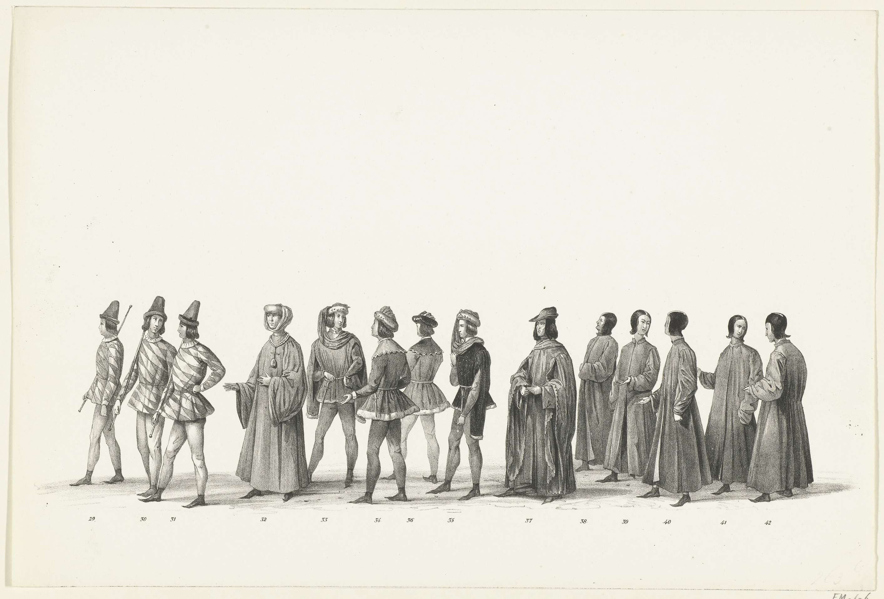 Optocht nrs 29-42: boden, thesauriers, raden en klerken van de hertog. Onderdeel van de prentserie van de Maskerade van de intocht van hertog Jan van Beieren te Leiden op 18 augustus 1420 door de Leidse studenten op 8 februari 1840.