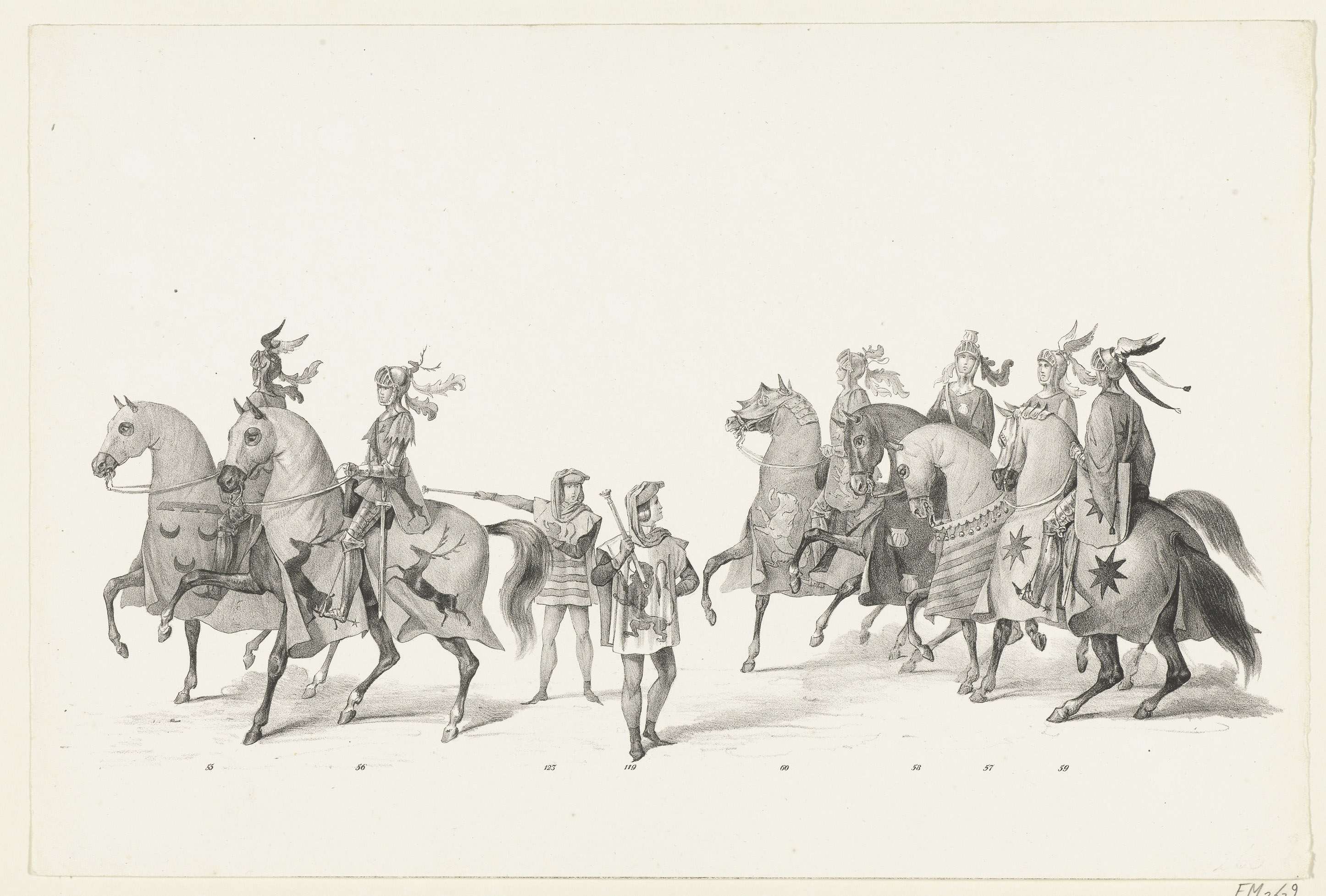 Optocht nrs 55-59: ridders en schildknapen te paard. Onderdeel van de prentserie van de Maskerade van de intocht van hertog Jan van Beieren te Leiden op 18 augustus 1420 door de Leidse studenten op 8 februari 1840.