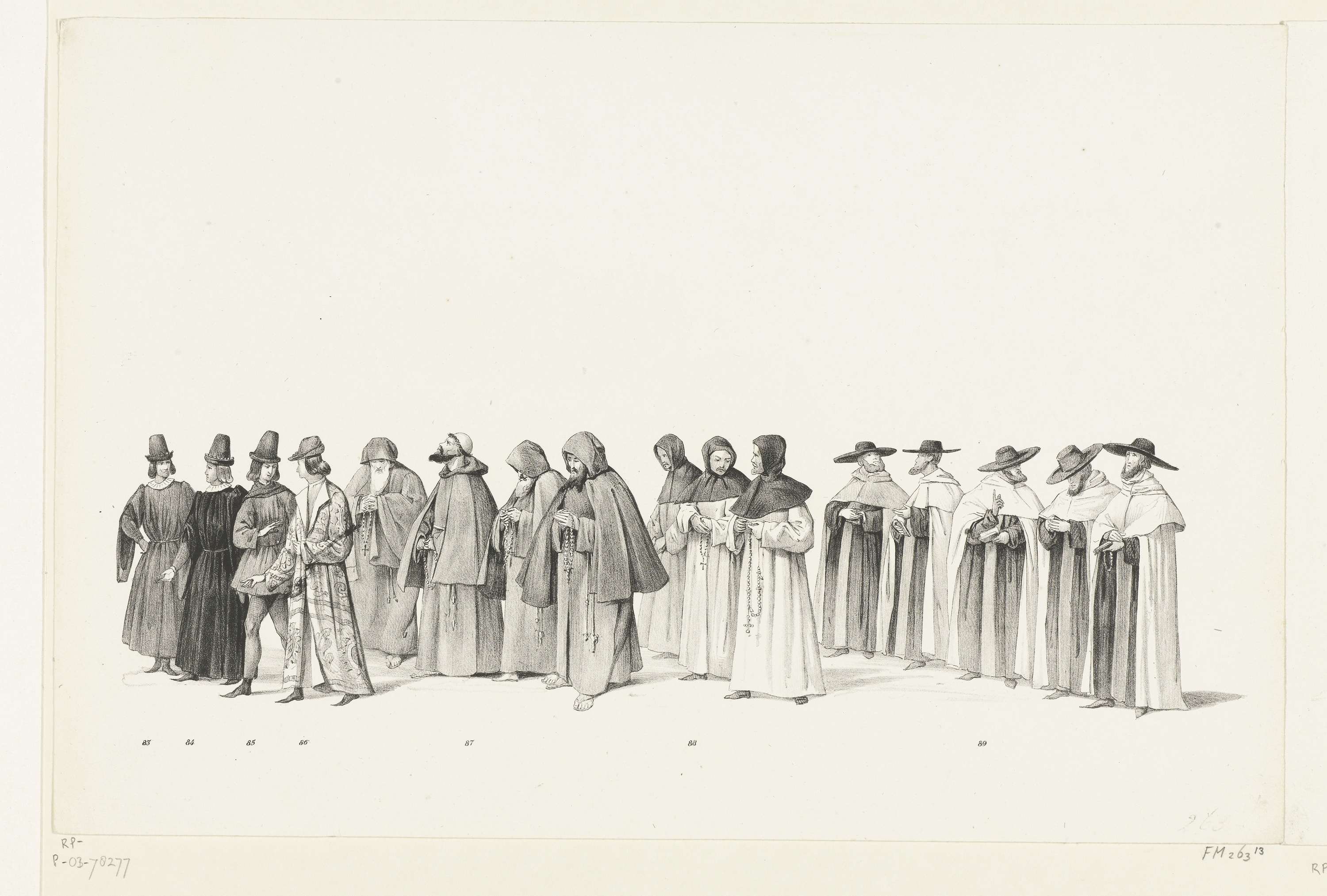 Optocht nrs 83-89: burgemeesters van Delft en drie groepen monniken. Onderdeel van de prentserie van de Maskerade van de intocht van hertog Jan van Beieren te Leiden op 18 augustus 1420 door de Leidse studenten op 8 februari 1840.