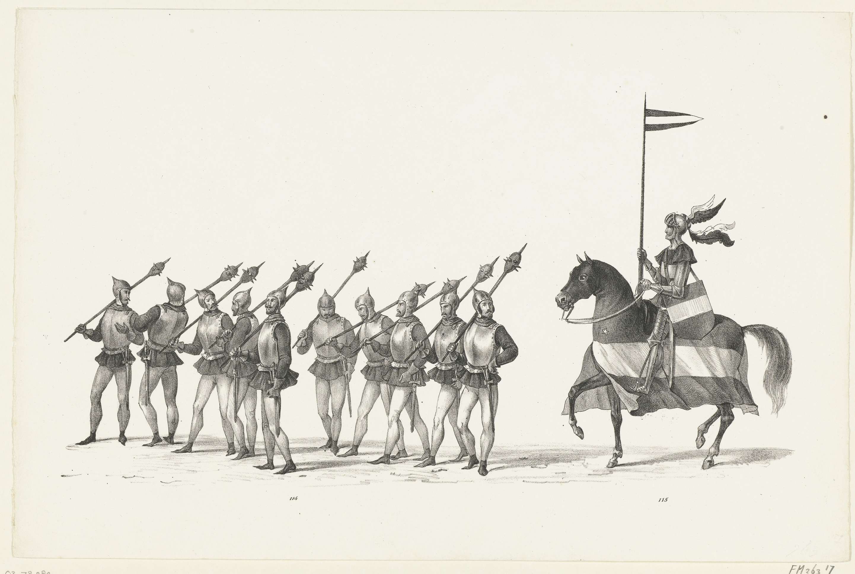 Optocht nrs 114-115: soldaten uit Gouda en een schildknaap. Onderdeel van de prentserie van de Maskerade van de intocht van hertog Jan van Beieren te Leiden op 18 augustus 1420 door de Leidse studenten op 8 februari 1840.