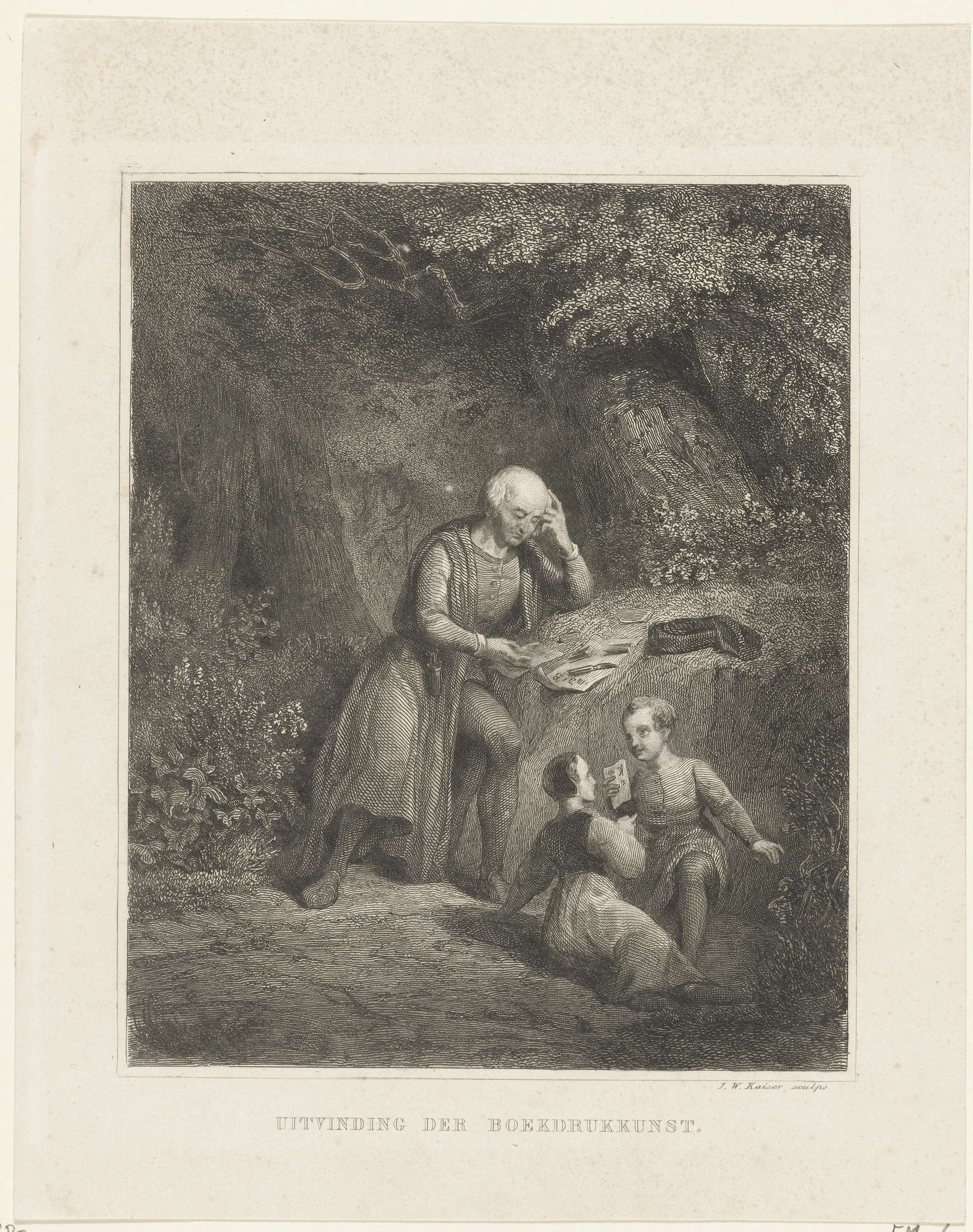 De uitvinding van de boekdrukkunst door Laurens Jansz. Coster te Haarlem, ca. 1440. Coster peinzend onder een boom in de Haarlemmerhout, met twee spelende kinderen.