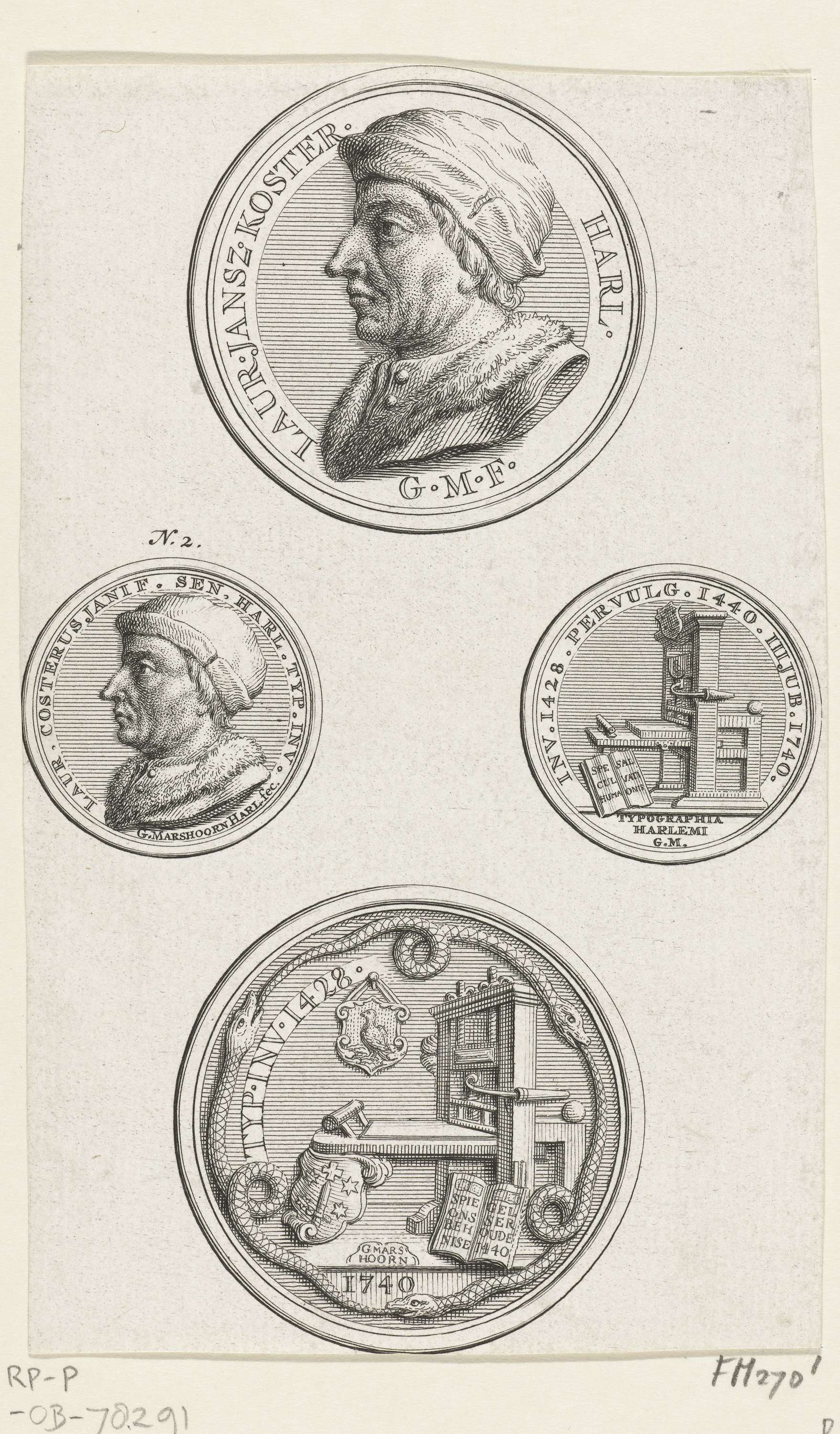 Twee penningen, voor- en achterzijde, geslagen in 1740 ter gelegenheid van het derde eeuwfeest van de uitvinding van de boekdrukkunst. Afbeeldingen van Laurens Jansz. Coster en een drukpers.