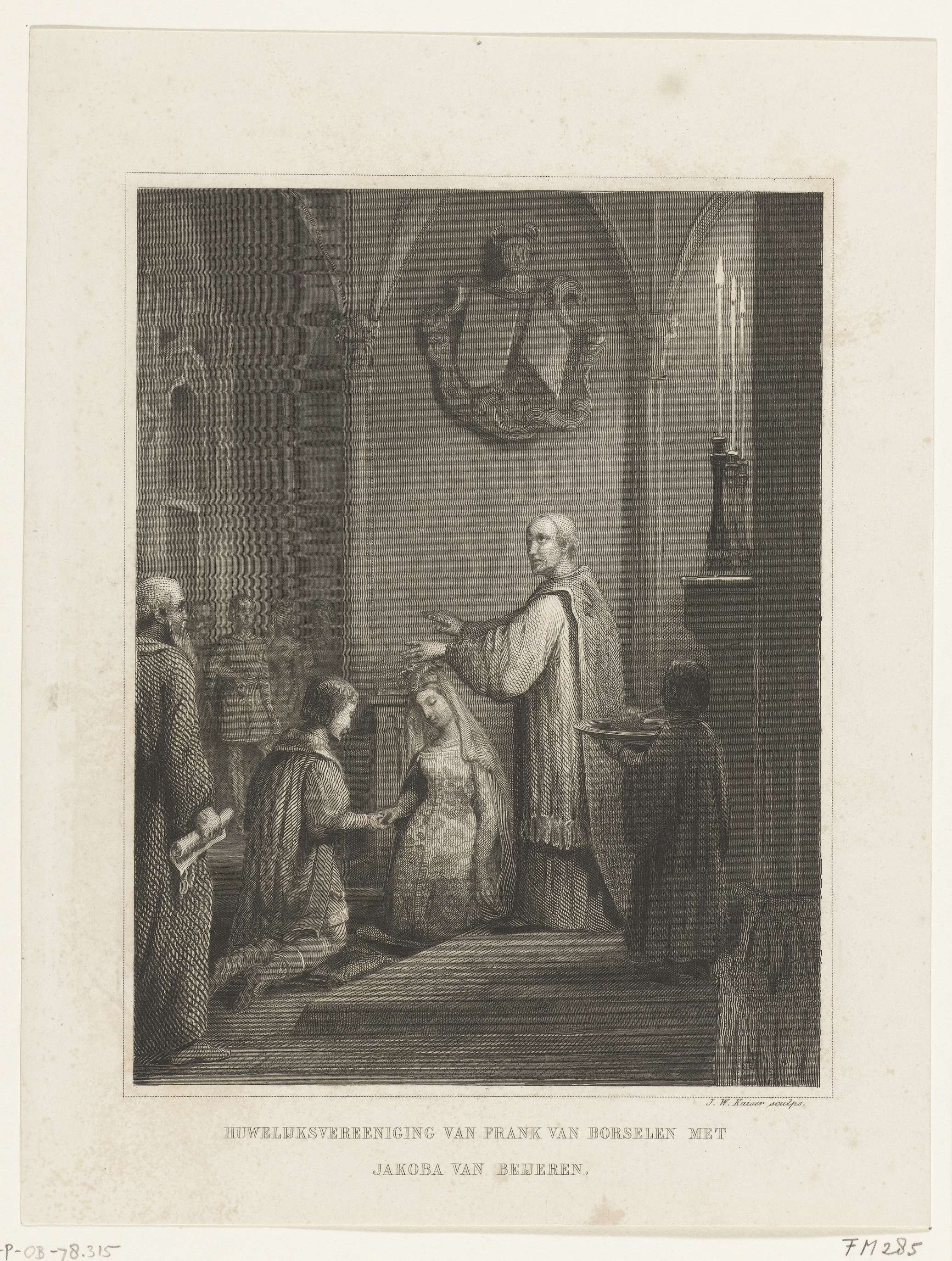 Huwelijk van Jacoba van Beieren en Frank van Borselen, 1 augustus 1434. In een kerkinterieur zegent een priester het knielende paar.