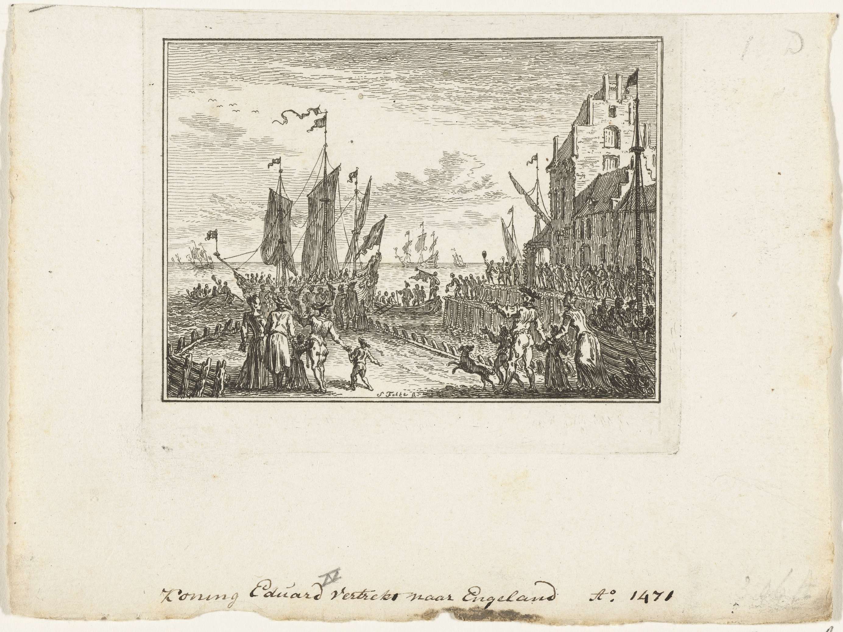 Koning Eduard IV vertrekt naar Engeland, 1471. Het schip wordt vanaf de kade door een menigte uitgezwaaid.