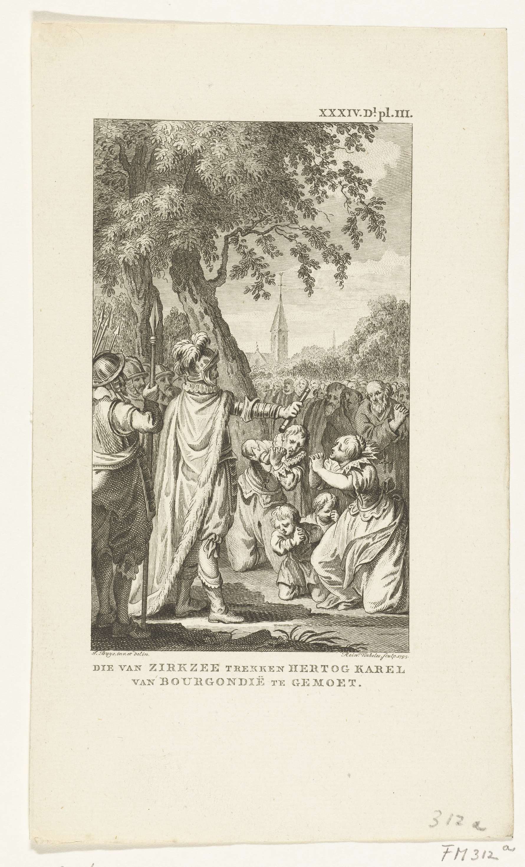 De inwoners van Zierikzee trekken Karel de Stoute tegemoet en smeken de hertog op hun knieën om genade, 1472.